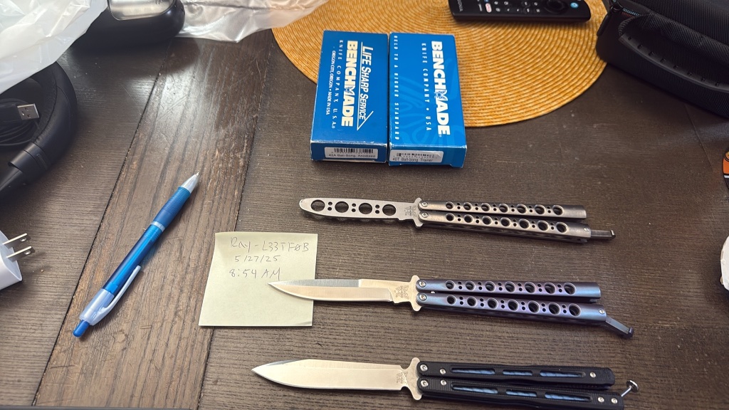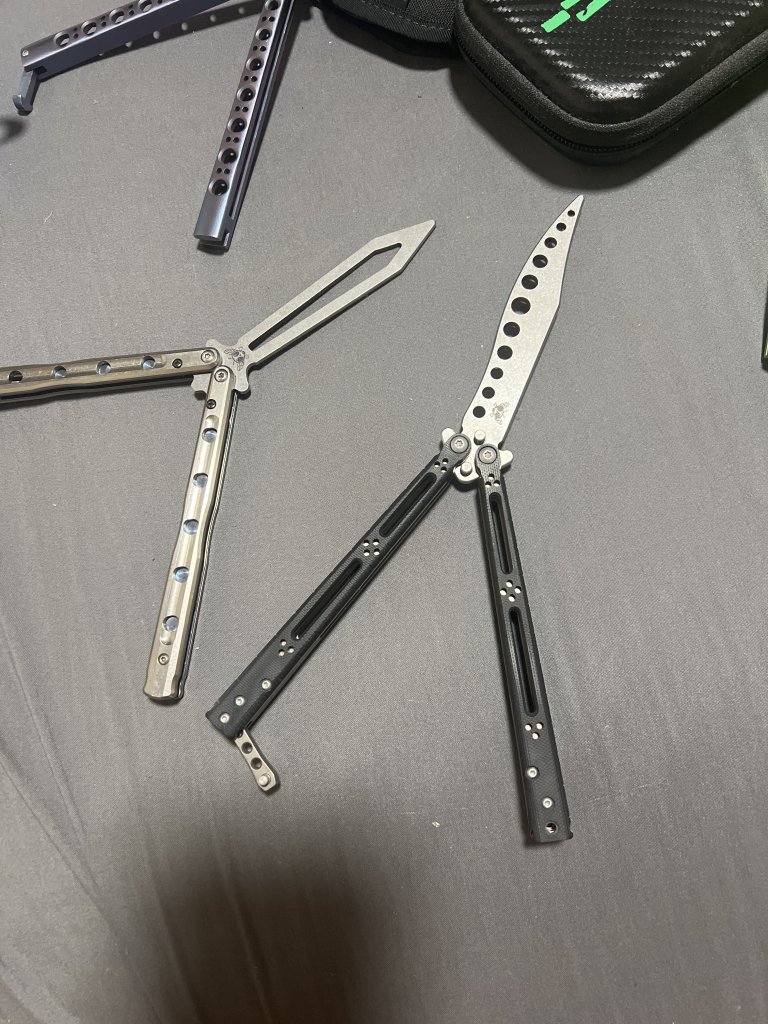 Do kitchen knives count? I've got some opinel pocket knives, but they're nothing to write home about. Not good lighting, but here's a carbon steel Nikiri I picked up in Japan. If you're ever in Tokyo and like cooking knives, definitely check out Kamata Hakensha, they've been in business over 100 years (https://www.kap-kam.com/en/).