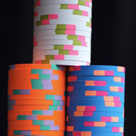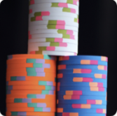 Look at this one. A blue chip with a black spot, a blue spot, and a purple spot, And an oversized inlay that covers half the spots. So you print the other half’s of spots on the inlay, align them, and perfect.