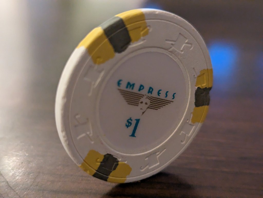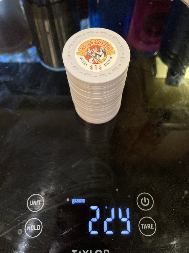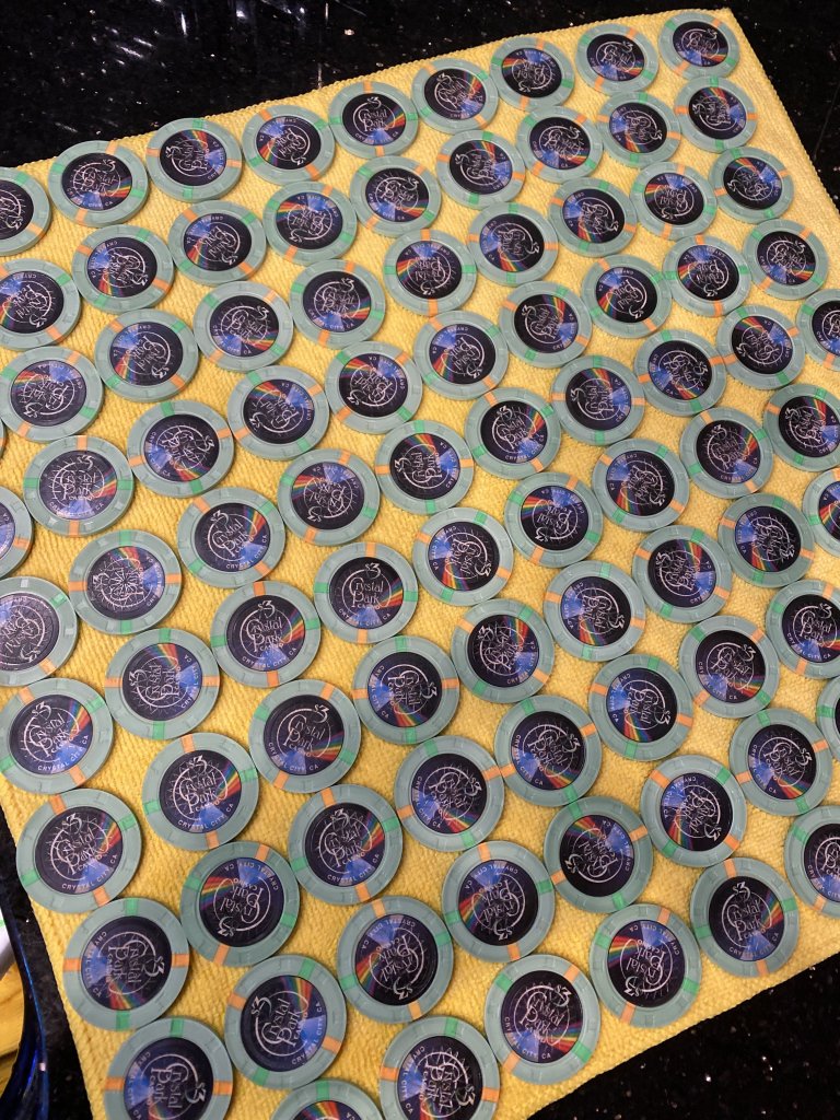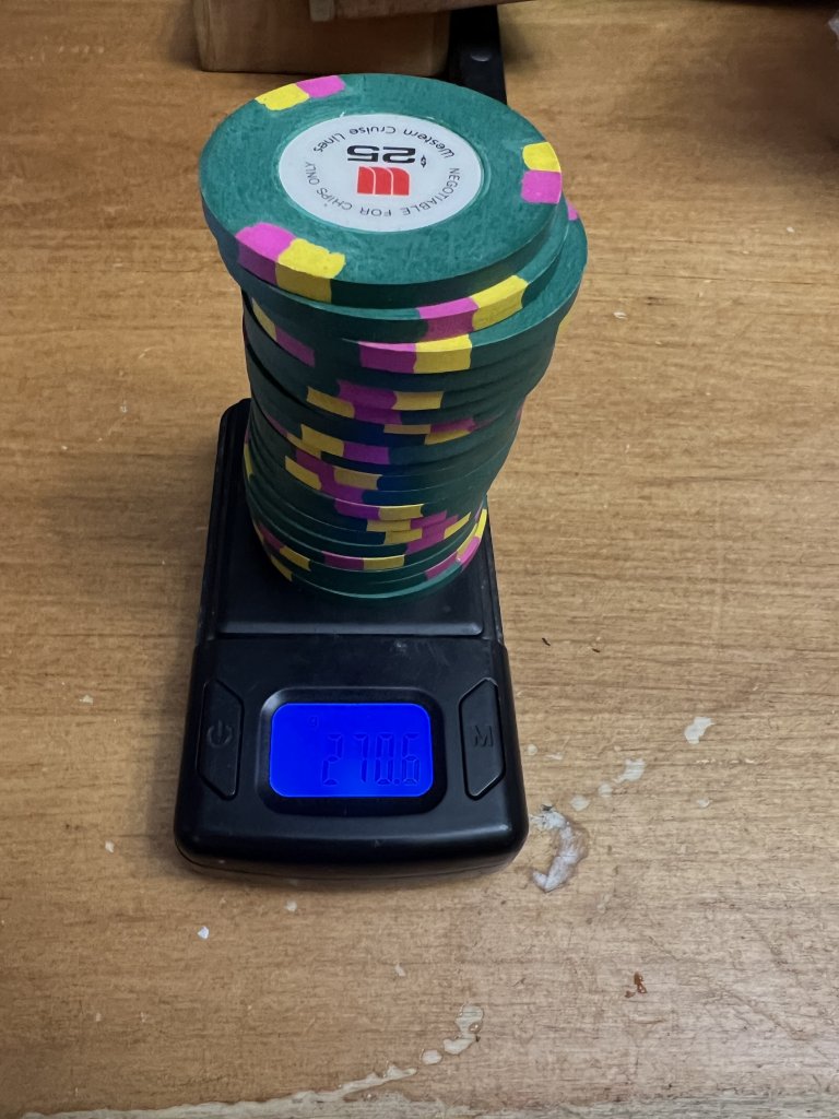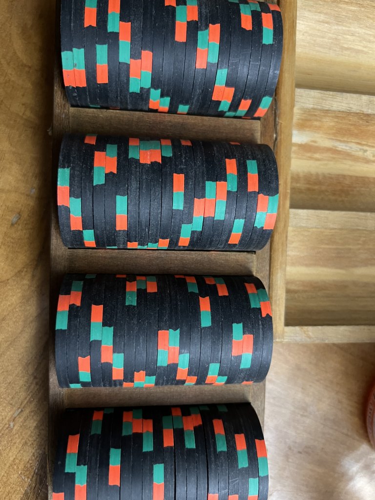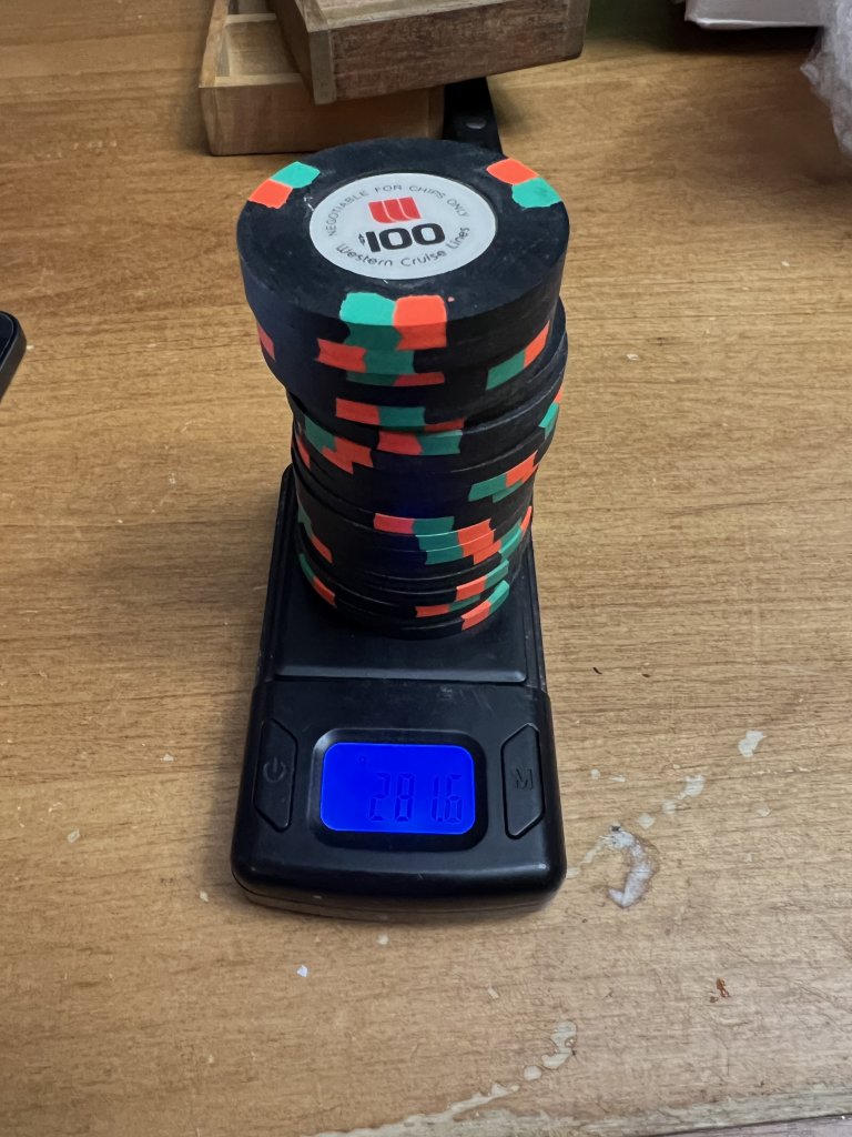 But seriously, he's been super interested in my poker chips for a while. This covers a lot... hot stamped, inlaid, solid, edgespots, denominated, non-denominated, No Cash Value, weighted, un-weighted, and various molds (including that scroll mold Rounders $1k hiding in the CSQ sample set). It's super educational, right? We'll save advanced topics like shaped inlays and oversized chips for next year.