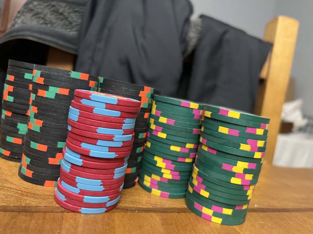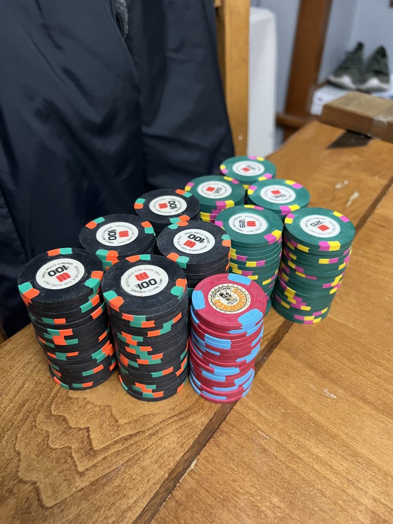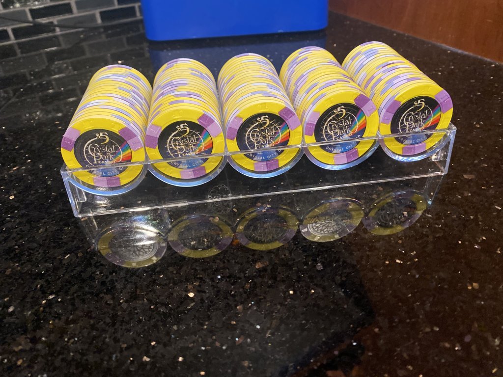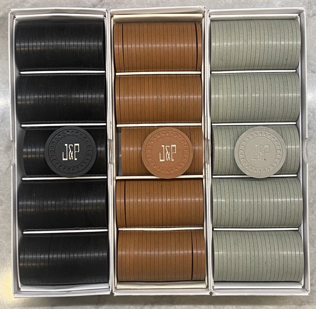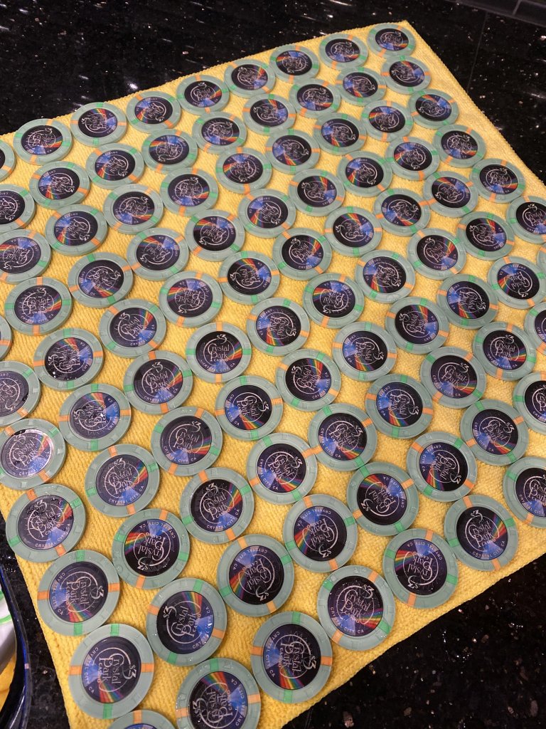 But seriously, he's been super interested in my poker chips for a while. This covers a lot... hot stamped, inlaid, solid, edgespots, denominated, non-denominated, No Cash Value, weighted, un-weighted, and various molds (including that scroll mold Rounders $1k hiding in the CSQ sample set). It's super educational, right? We'll save advanced topics like shaped inlays and oversized chips for next year.