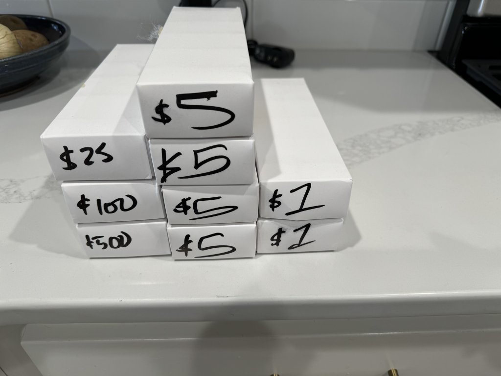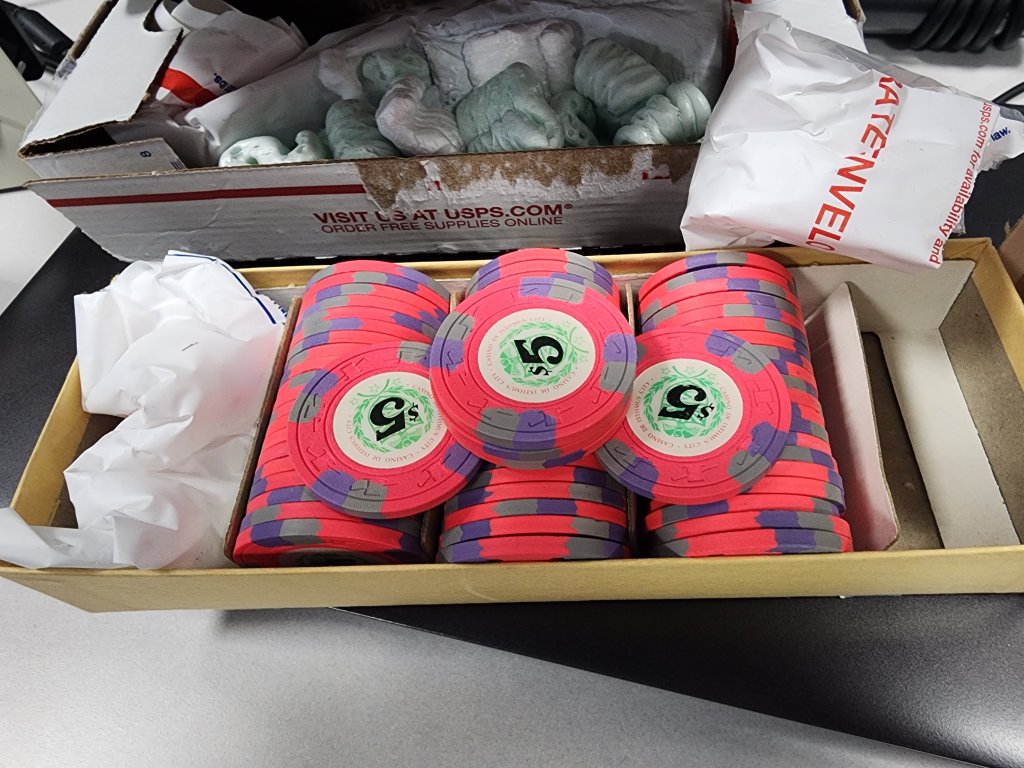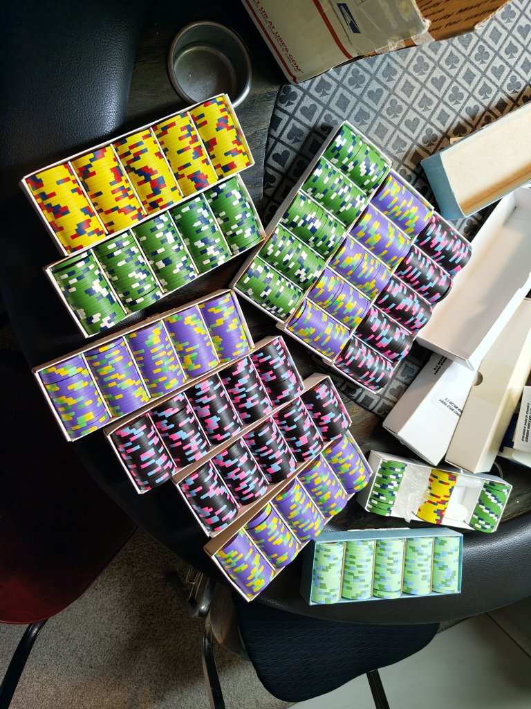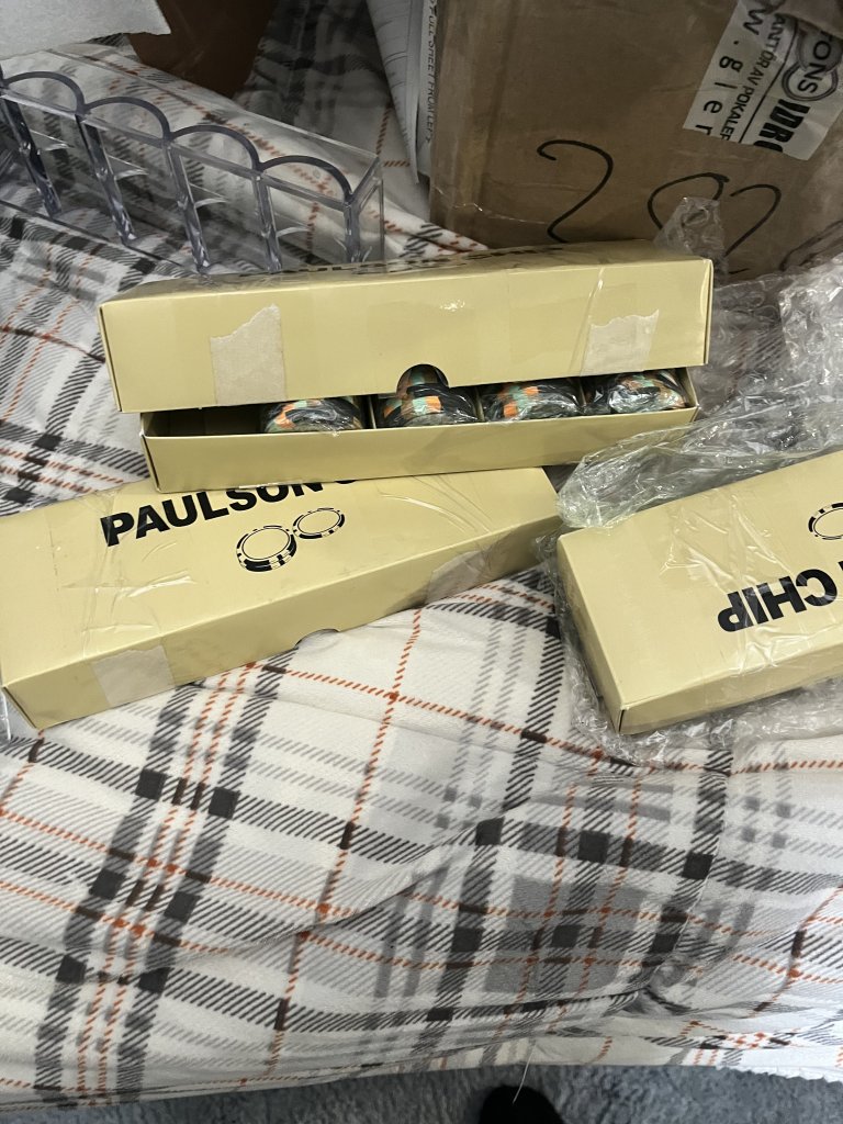 Never had a box show up like this. Postal worker said it looks like something was leaking from the inside. They are poker chips so I sure hope not. Lol. This is also the reason I use way too much tape and so did @Eriks took way too long to open these but they are all in amazing shape and zero water damage thanks to some unreal packaging. Can’t wait to play with them. The 5’s are unreal.