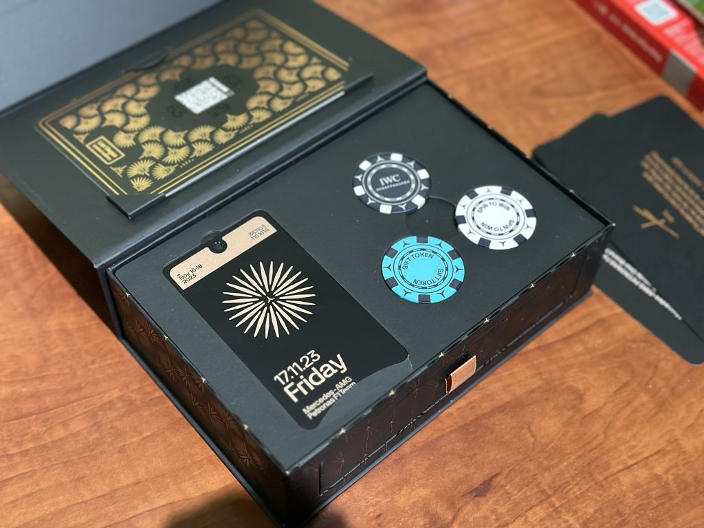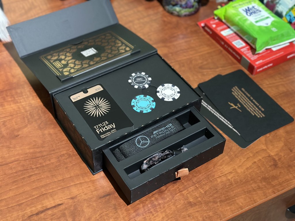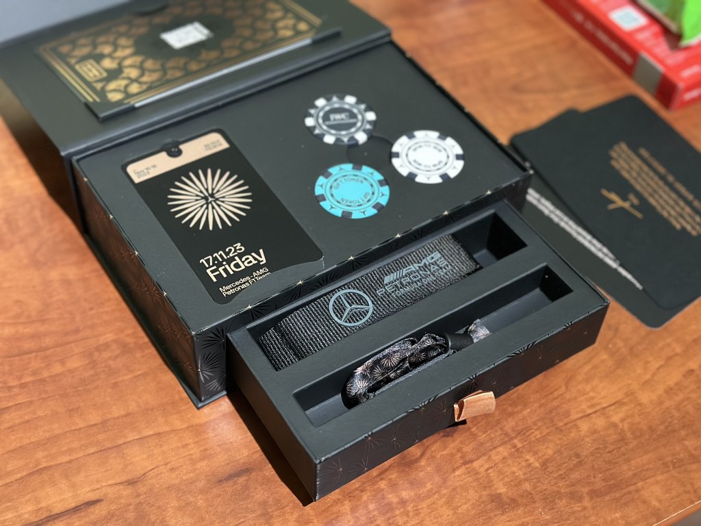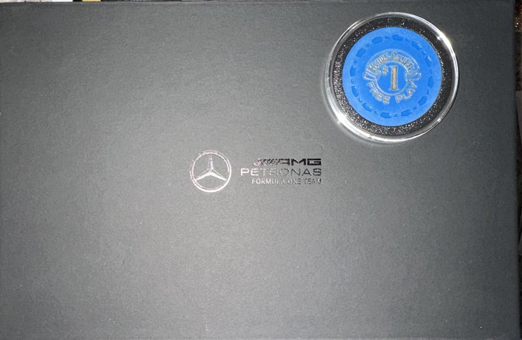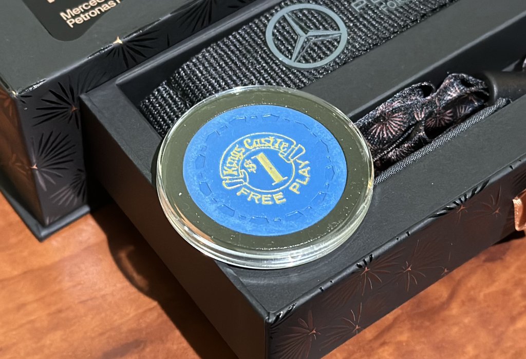 Got this insanely cool gift from @DirtyTIVA! As someone who has watched F1 since a little kid it’s been a dream to have something as cool as this, possibly attend an event and do I even say.. work with a major company like Mercedes to help create something for F1. Never did I think I’d have that opportunity until I got a call at work one day in October followed by an email. This was the start of helping Mercedes get custom chips made for their giveaway items (or at least that’s what I think they were) during F1 here in Vegas. These were given out for different days at the Mercedes paddock. The three chips I helped create, make sure they’d print fine and got them into production just in time for F1 to come to Vegas. The original plan was to also make custom playing cards too but we ran out of time to make that happen. I had no idea where the chips were going once they were made and I had no idea if i would personally see a set again but luckily I have my own personal set know. This whole package is so nice and I’m thankful to have someone like @DirtyTIVA in my life. Inside he also included a Kings Castle $1 Free Play TRK!
