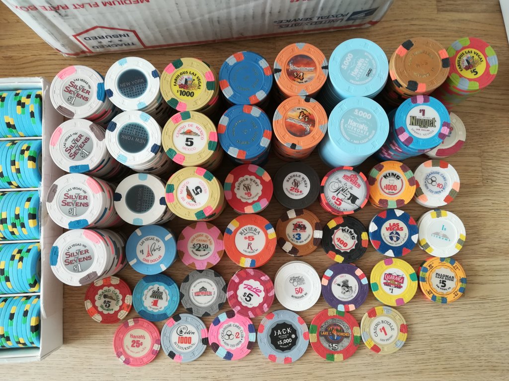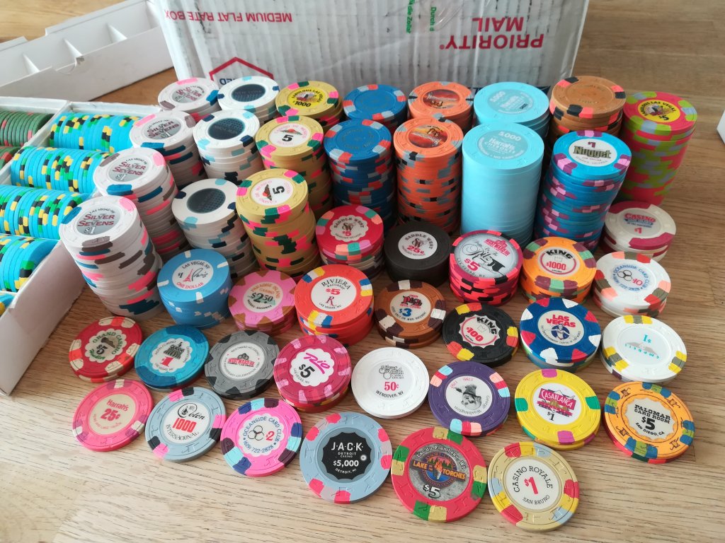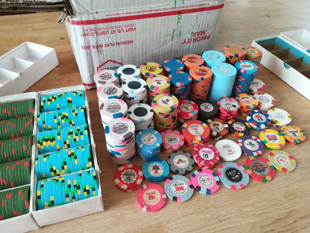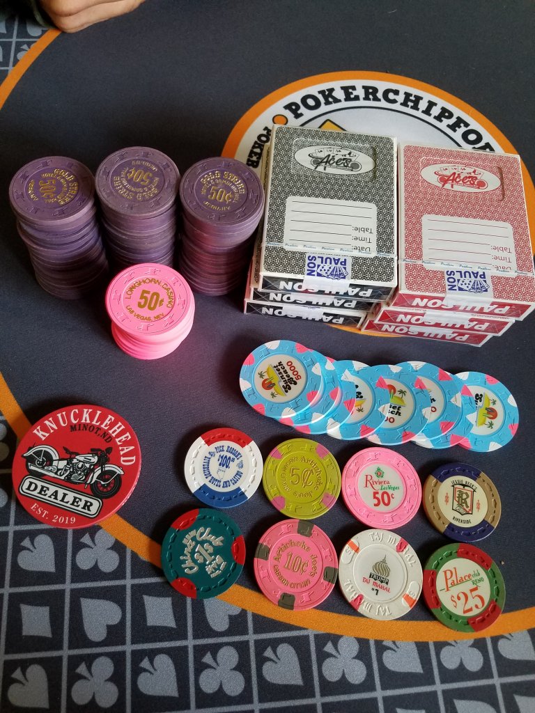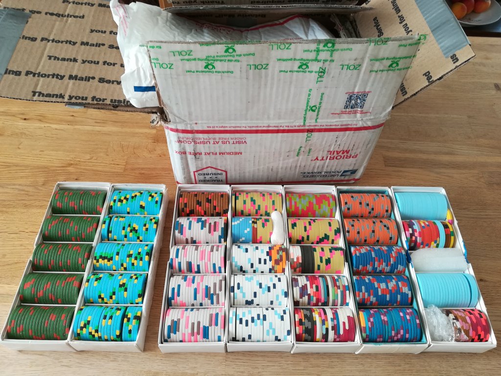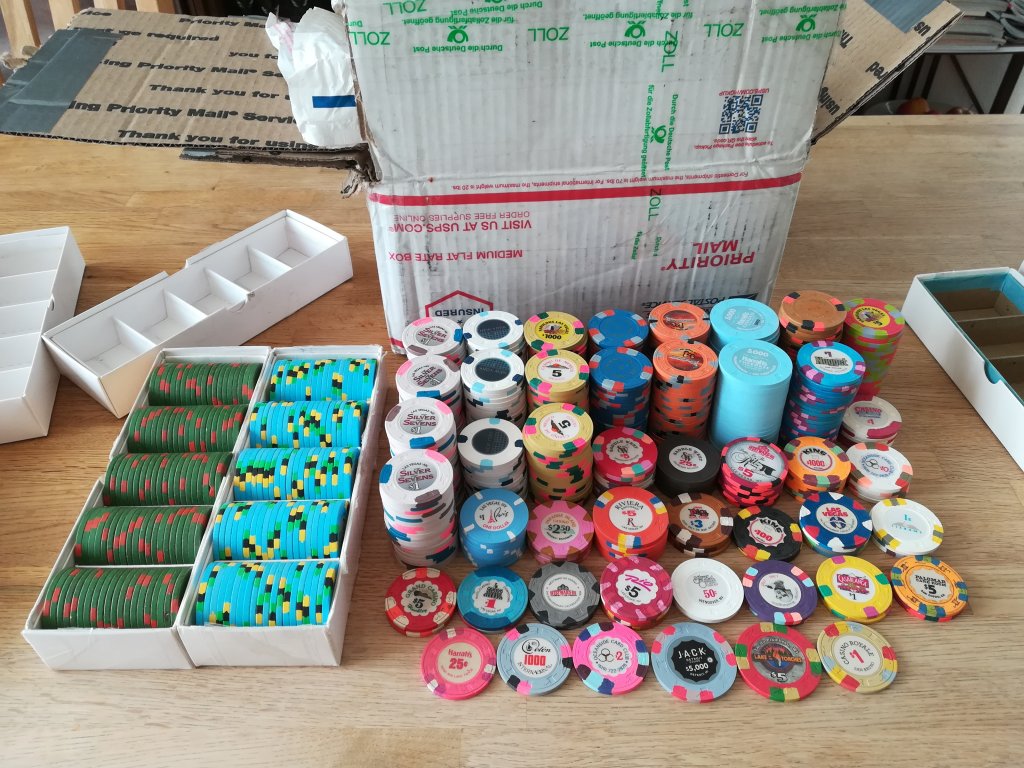 Not a huge mail day but still some quality chips! The (58) gold strike brings me to 197. 13 bright pink Longhorns from @markleteenie!!! A sweet dealer button trade with @Justin Olson!! A few more artichokes and SBs... last but not least a Pick Hobson's hundo @Lil Tuna 3 down 17 to go brother!!
