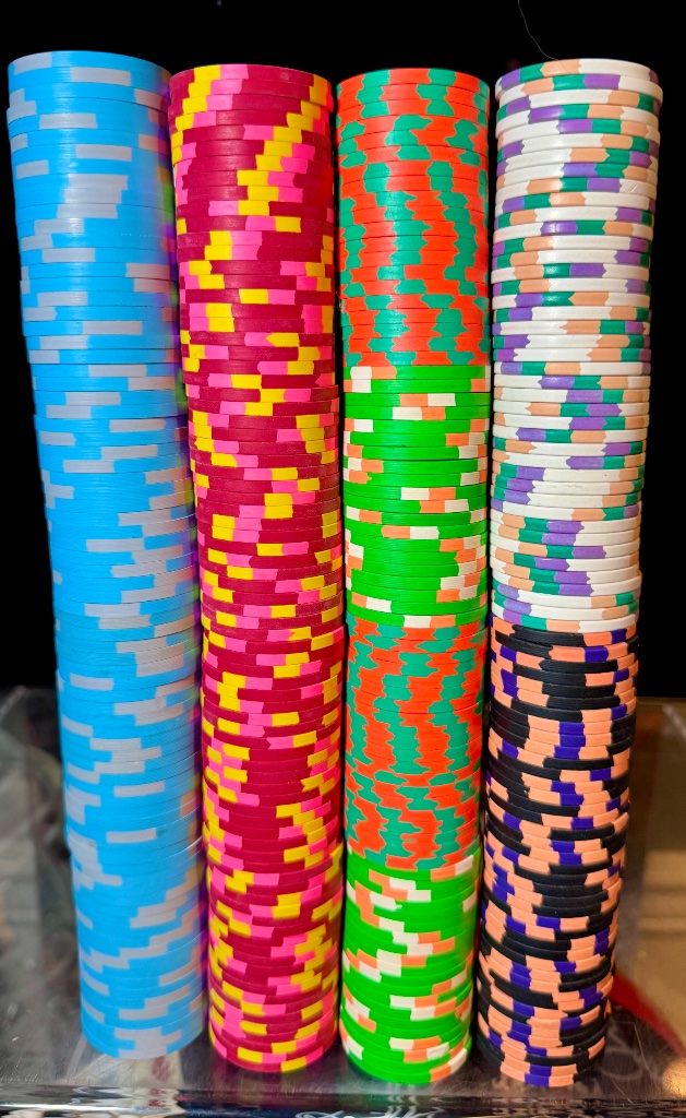 This is a KILLER 43mm set I love it. This was very well thought out. The more I study them, the more I can tell that a lot a care was put into the design. Even the denominations match the color theme of the chip, very cool. The pictures DO NOT do the colors justice. The 25's are little watermelon goodness. The 100's are super sexy holy shit, I love the light blue, lime green, and red edge spots. I'm all about a purple chip and the 5 hundo doesn't disappoint. Edge spot progression all the way through the set didn't go unnoticed either. The 1000 bear claw is super righteous, that's prolly gonna be the workhorse of the bunch. My favorite chip of the set by far is the 5K. I know a lot of people don't like a gray 5K, but how can you not like this one, it's a bad mf'er. Those edge spots are tremendous. The peach 25k rounds out the set with another killer edge spot design. Along with a sweeeeeeeet dealer button and a little bonus chip lol I couldn't be happier with the deal all the way around. Stay tuned for the cash set that will compliment this one. Thanks again for a great deal C I appreciate you can't wait to get these in play.