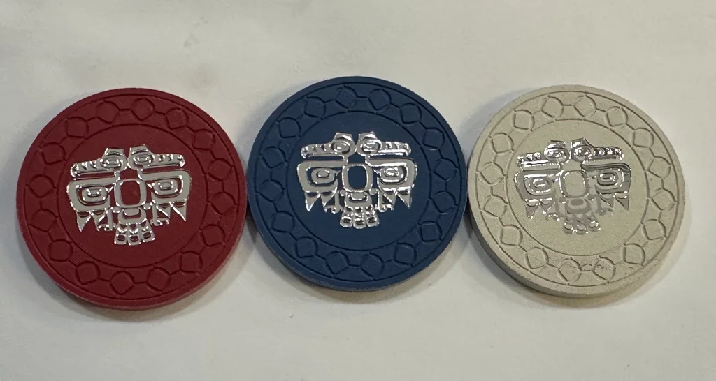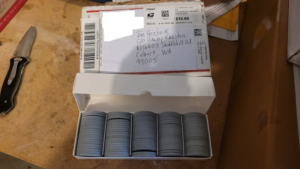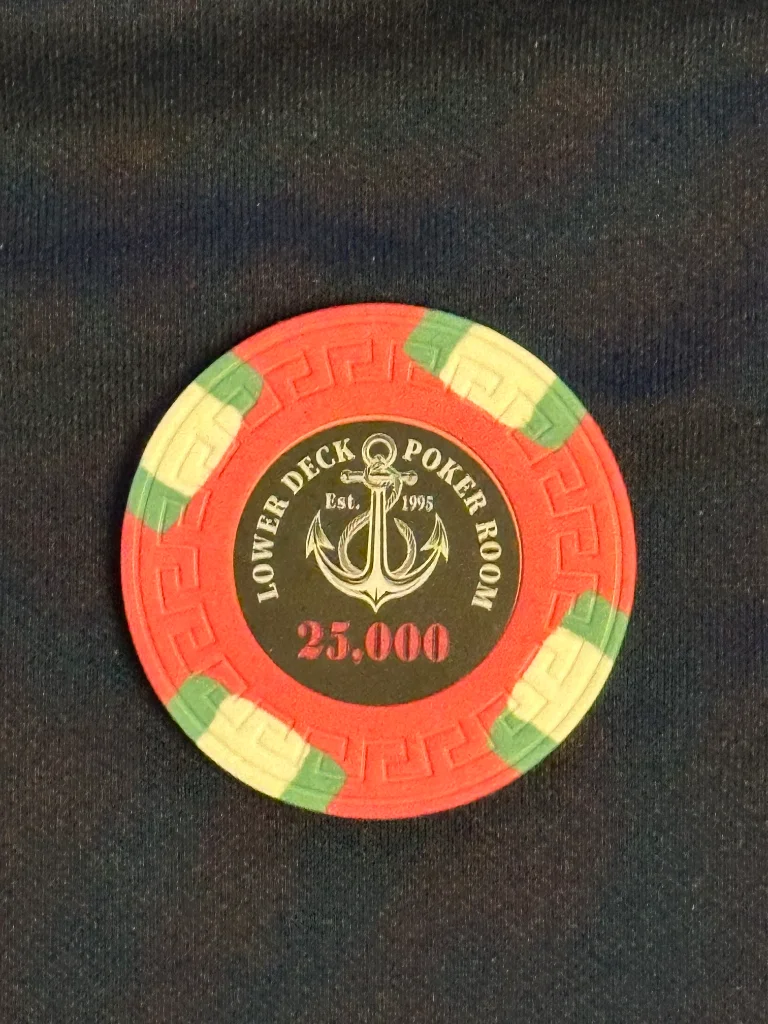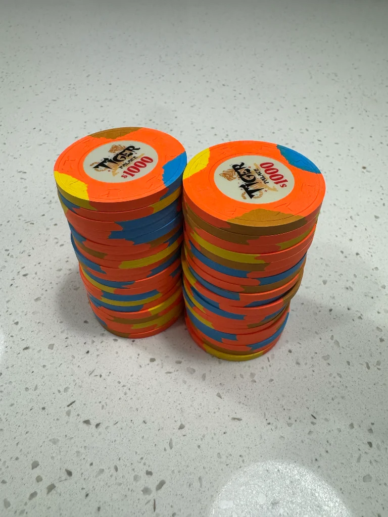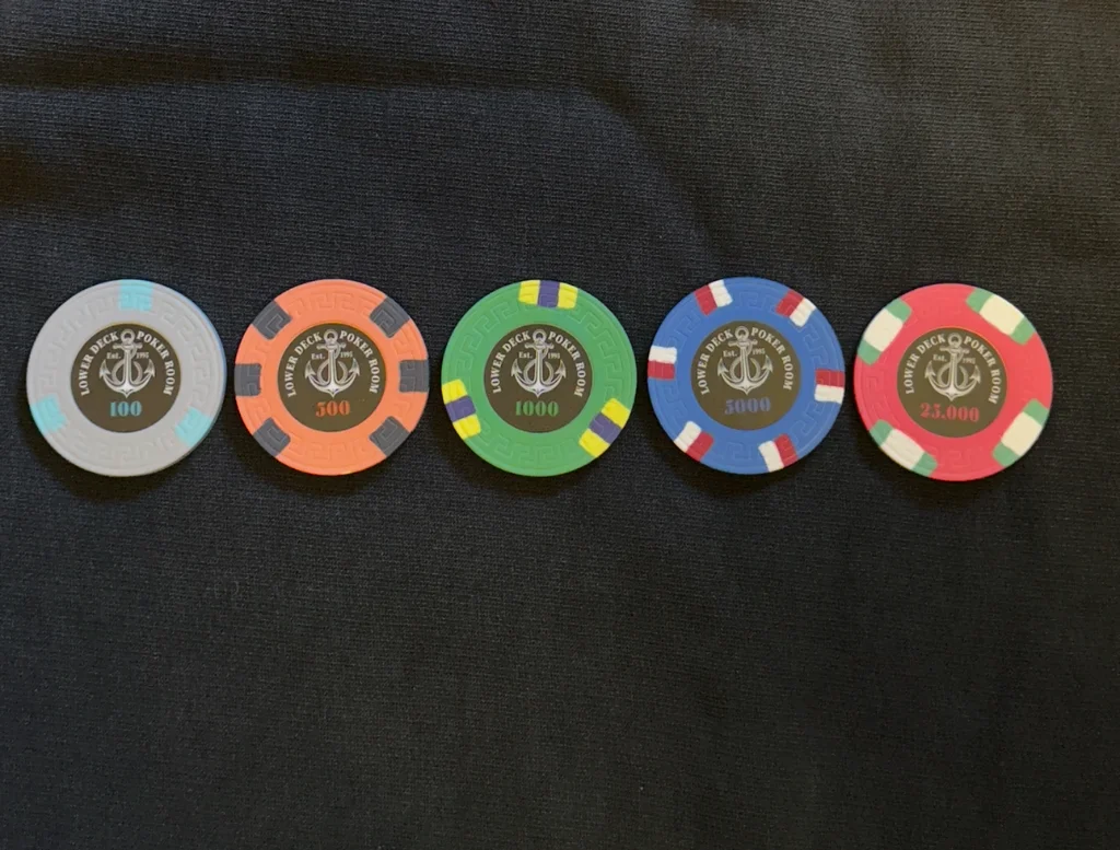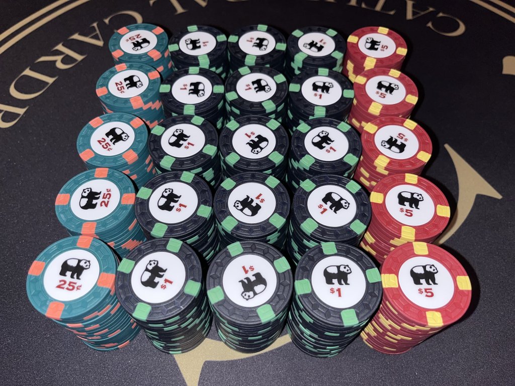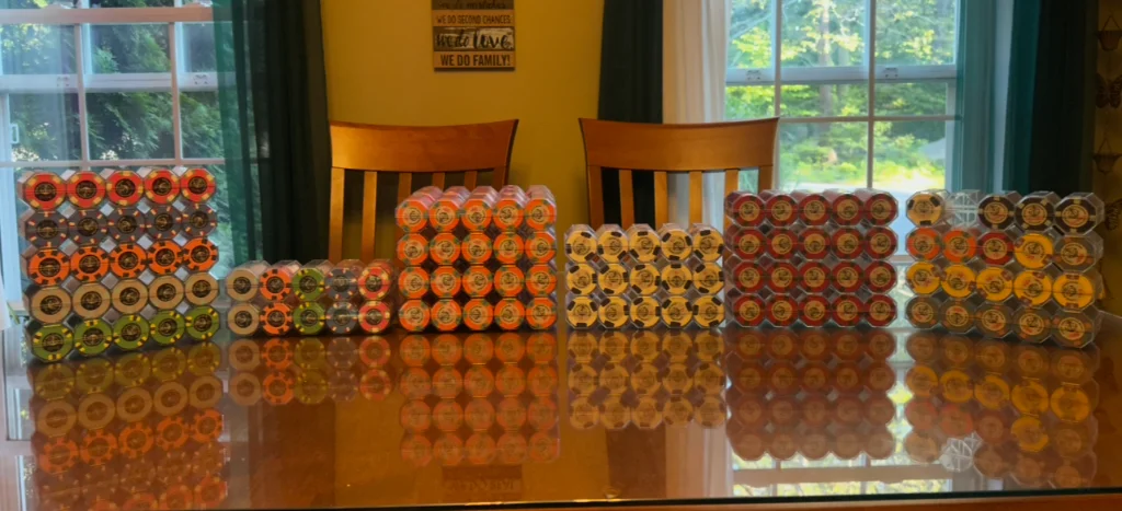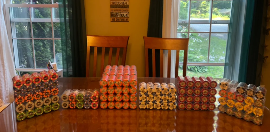 Okay two weeks later finally got to open and rack my chips. I just want to thank @justincarothers for a helpful, smooth process for a newbie. Also a big thanks to the designer of the chips @mattross1313, matt was great to work with and super friendly. First tourney set 125 each of 100, 500,1k, 5k, 25k the extra 25 of each is for lost or damaged chips. So a little flexibility in the tourney set. Then limit/cash set .50 (1,225) $1 (300) $5 (400) $20 (100) $100 (100) member chip (50). I’m happy with the chips for a first tourney and cash sets purchase. Working on dealer button right now with @mattross1313. Okay these are cell phone pictures, I will take more and better ones soon but here’s a taste of what they look like.