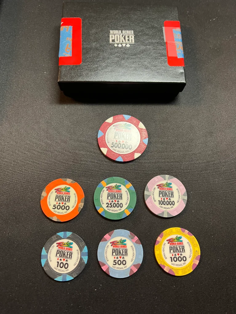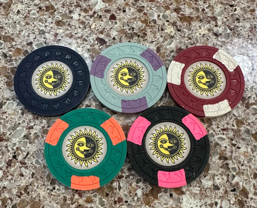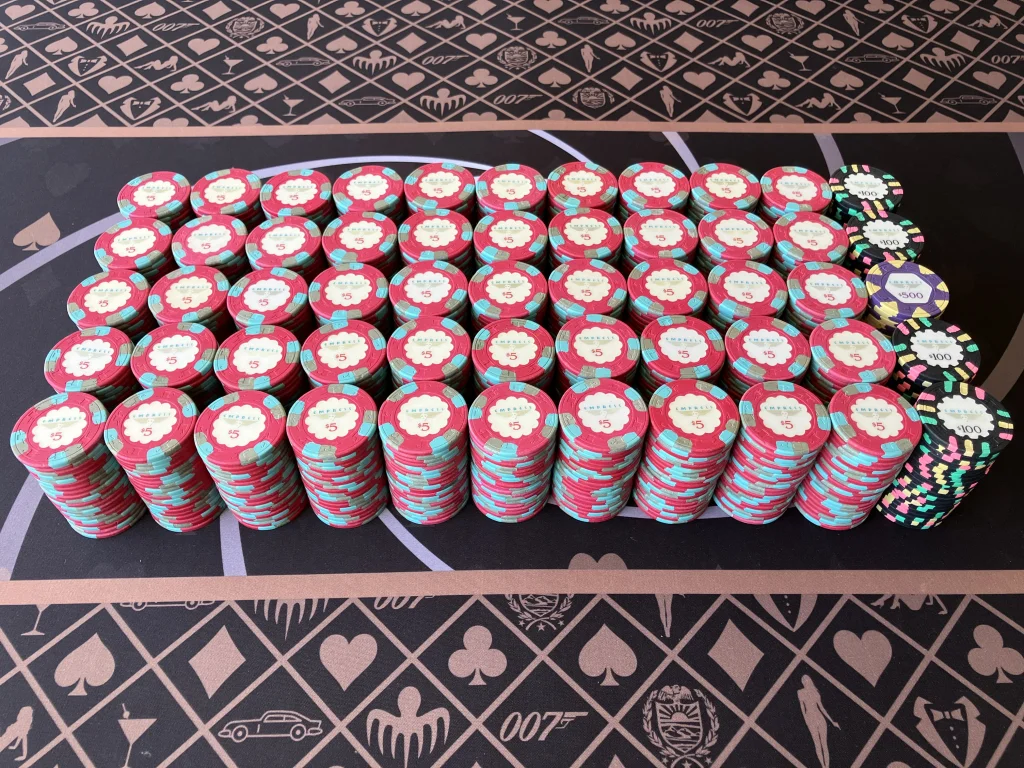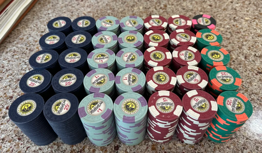 Colon chips will be re-labeled as Silver Club $500s (blurple x 19) and $1K (metallic gold x 1); the rest are futile barrel/rack building attempts :).