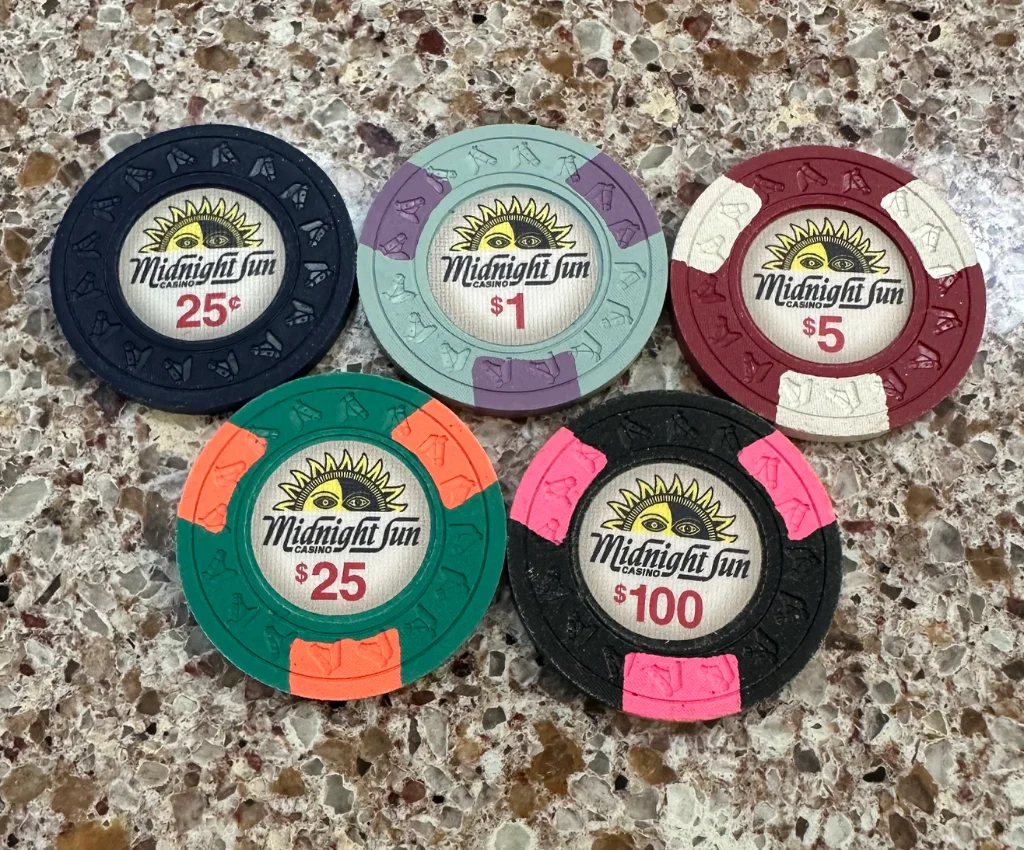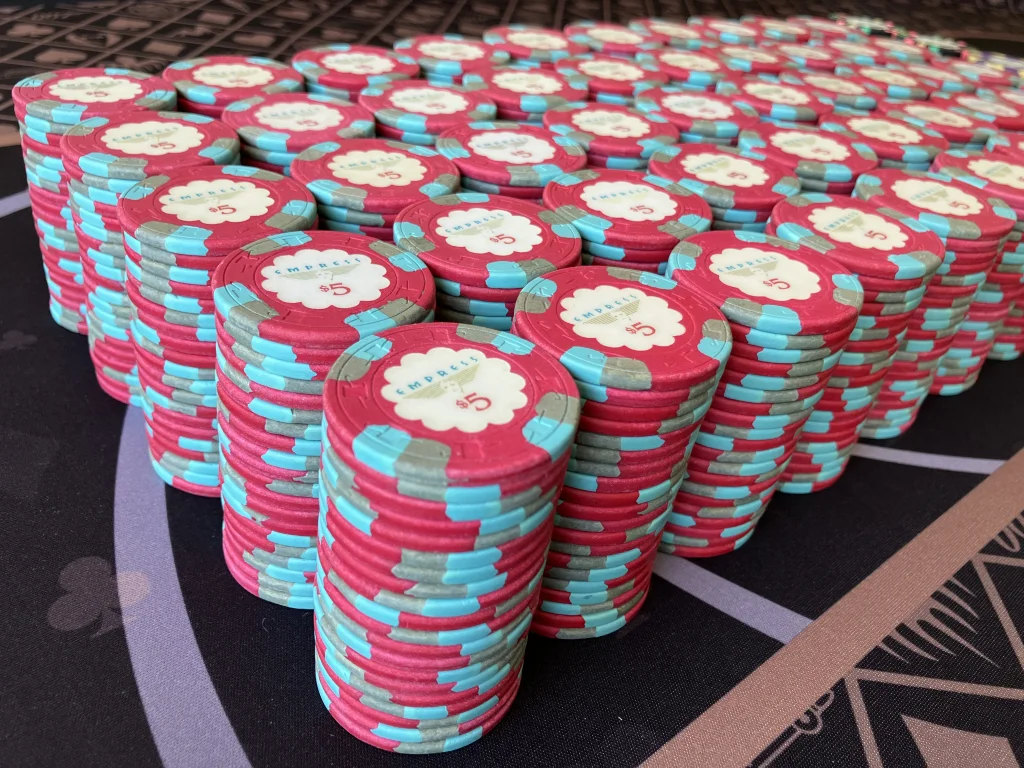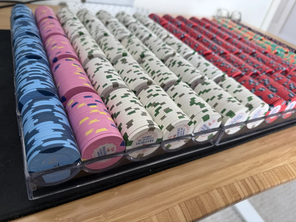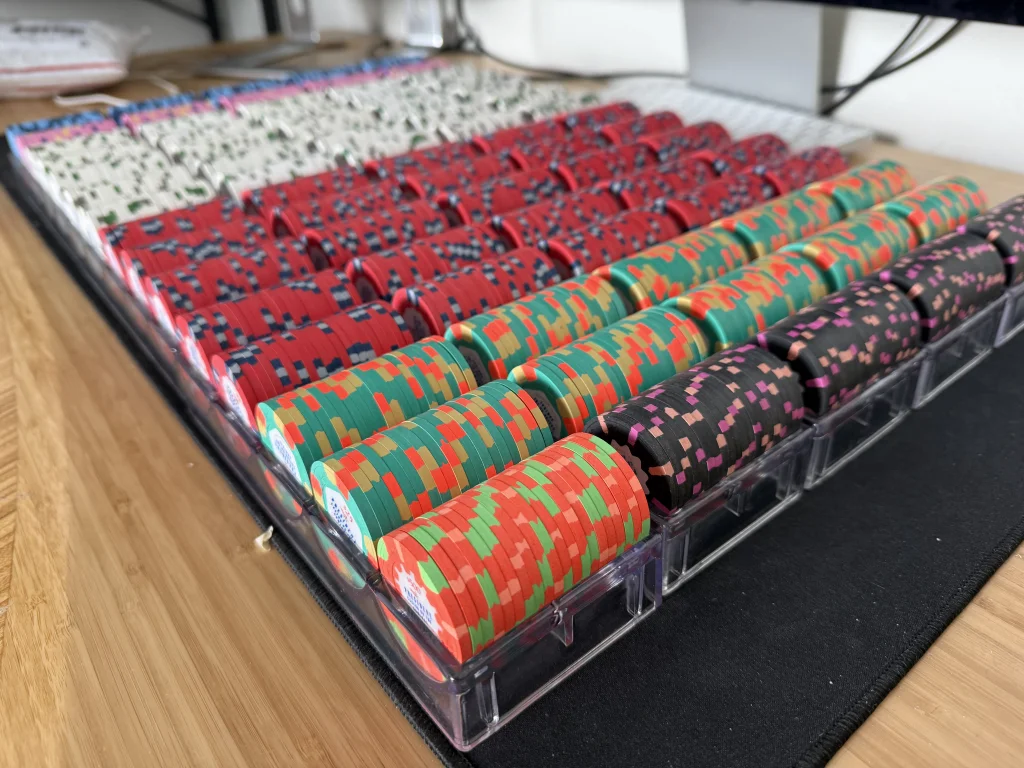 Colon chips will be re-labeled as Silver Club $500s (blurple x 19) and $1K (metallic gold x 1); the rest are futile barrel/rack building attempts :).