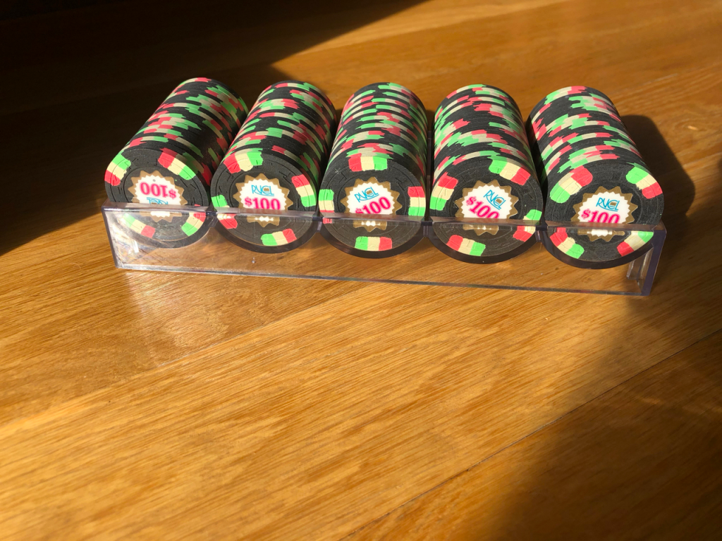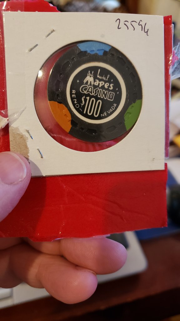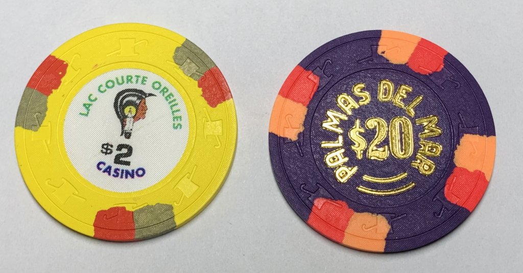 I found all the cash chips I have, all mint/unplayed - $.50, $1, $5, primary $25s and more secondary $25s.