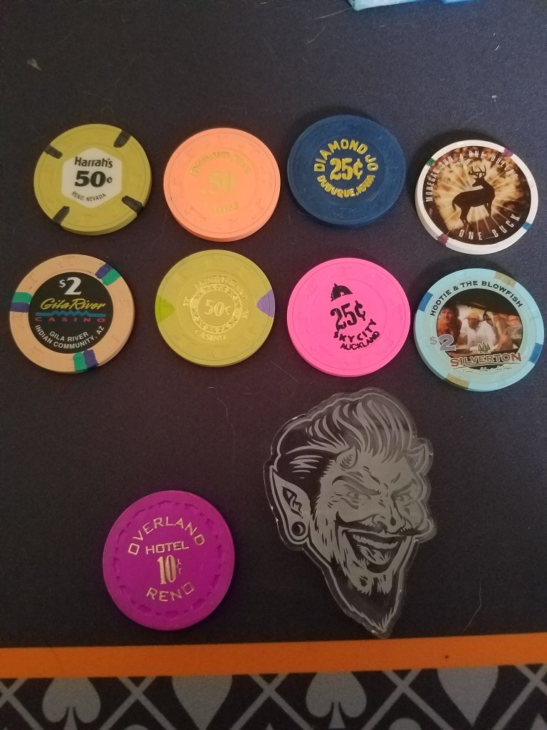 Cool mail day!! Shout out to my brother @Jeevansluck the STD button made it in perfect shape!! My first Overland Dime... thinking about another multi year project trying to build a rack to play with the Pick Hobsons.... ohh and @FordPickup92 bought this Silverton $2 because she loves chips with card fans... not realizing the other side was one of my dream Chips! The Hootie & the blow fish series... I had an opportunity a while back to buy the full set of (5) and haven't seen any since! Still much love for Hootie!! Lol