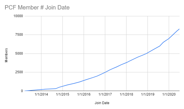 Here's a quick chart I put together showing the increased membership rate of PCF. Granted, they're not all still active or even necessarily chip buyers, but you can see the community growth and consider the impact on the "limited" supply of chips.