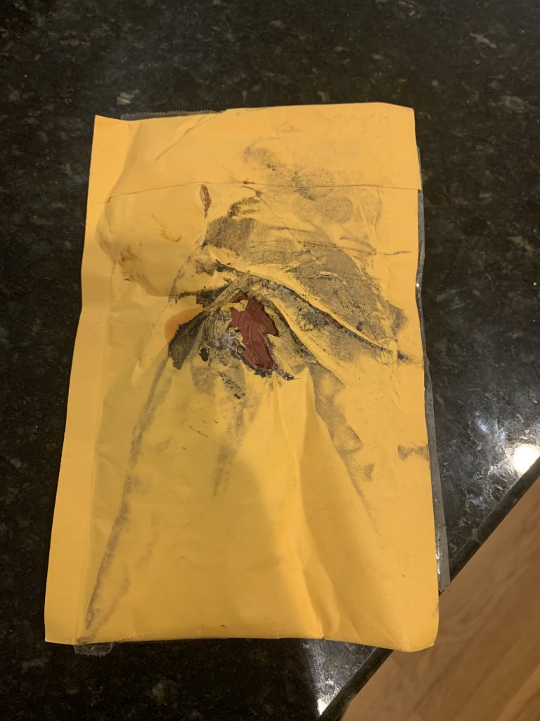 If seen that happen to bubble mailers and envelopes sometimes from getting caught on the conveyor belt.... I would hope the mail person didn't wedge it under his/her tire and peel off on it.