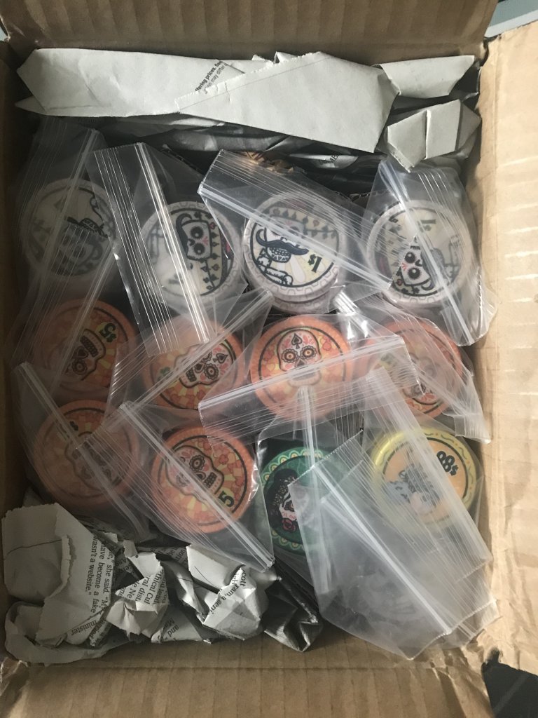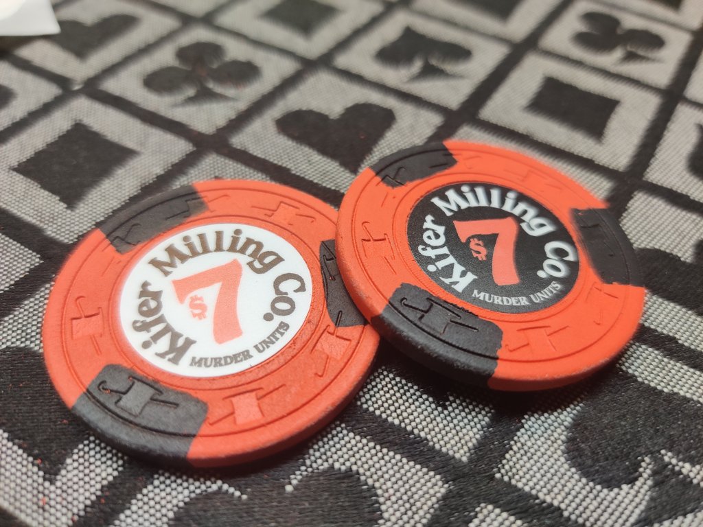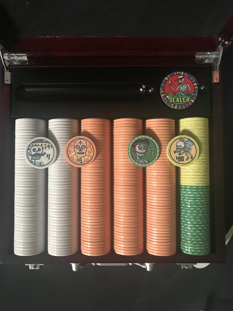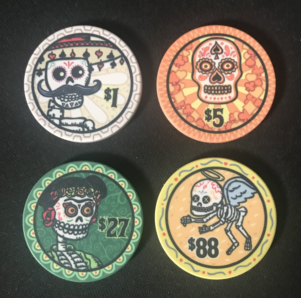 I also got compliments for the black bounty chip and the white show 'em chip. The black because it's the grim reaper and what cool effect that is, and the white one because the guy with the sombrero and oversized mustache looks like a very creepy guy or a pervert, and him saying "Show 'em" is just something you can't unsee. Those are now 47mm chips after this idea was imposed: