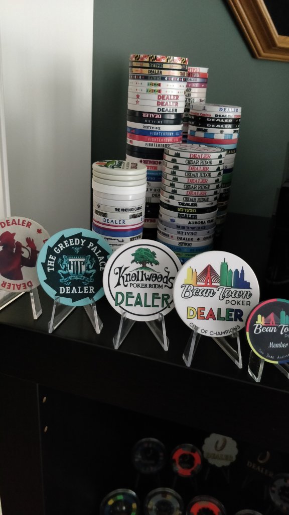 I've never had personal doorstep with rung doorbell service by Canada Post on a Sunday before. It happened today, and it was chips. CHIPS!!! Custom DB and custom cut cards special thanks to @72o . Alan, you are just fabulous for sending these to me all the way in Canada. I really appreciate it. Super cool man! Love these cut cards and DB. They will grace my poker room alongside some others.