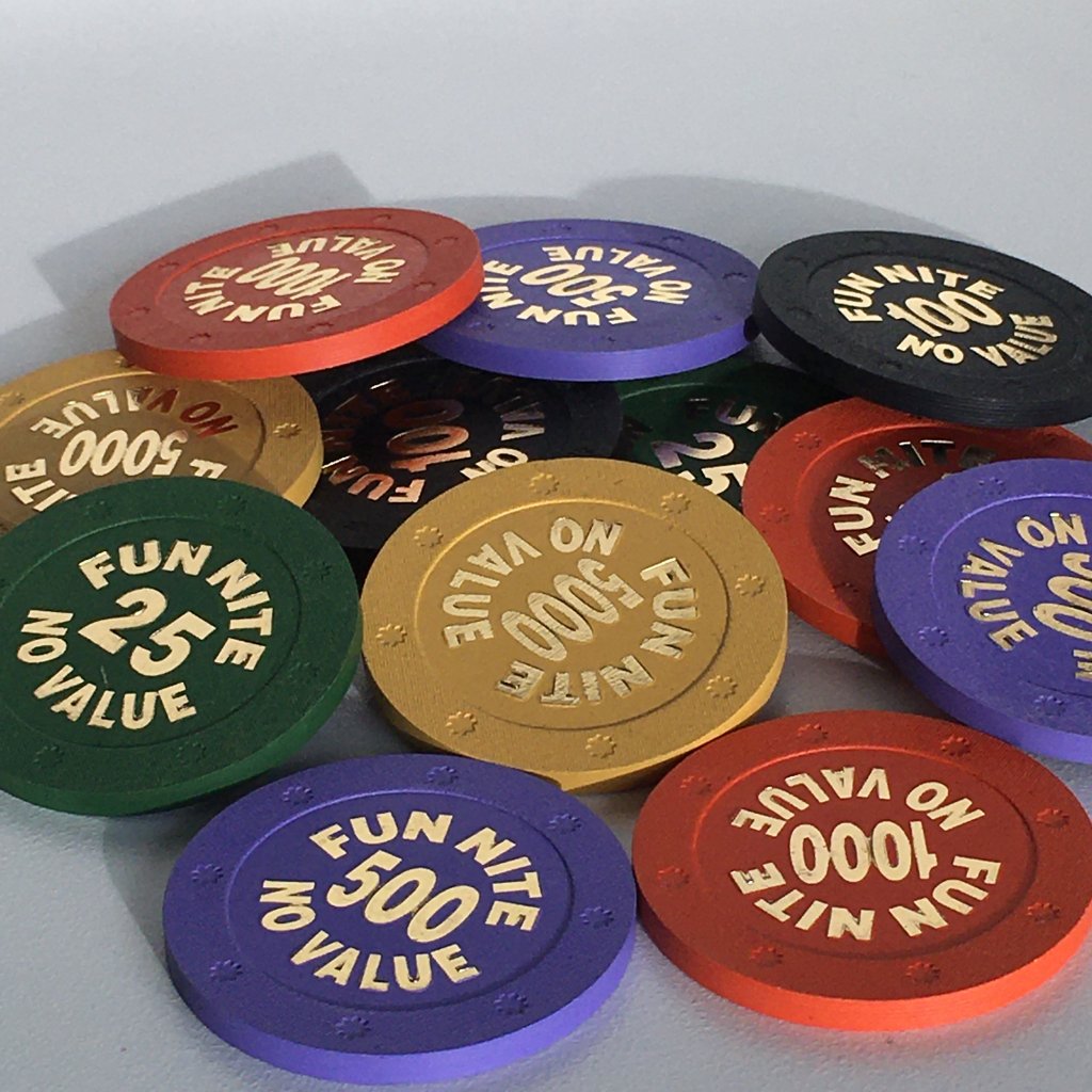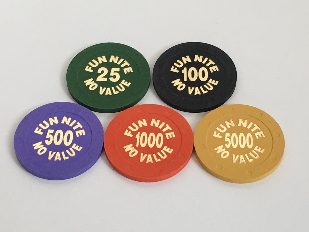 BCC (Blue Chip Company) Sun mold tournament chips. I believe they are now referred to as the Flower mold. You'll find lots of "Fun Nite" stamped chips on Paulson Hat & Cane mold, too. Some might have branding on the hot stamp, but most do not.