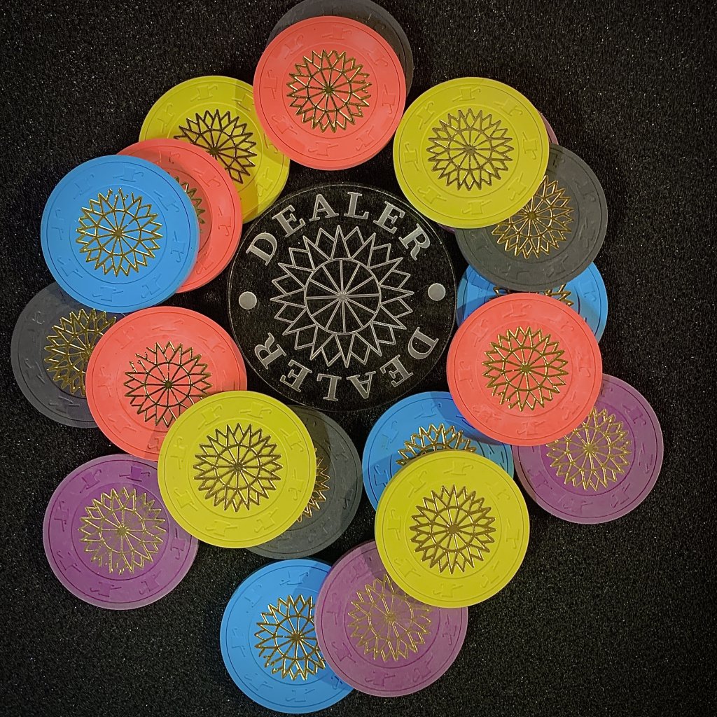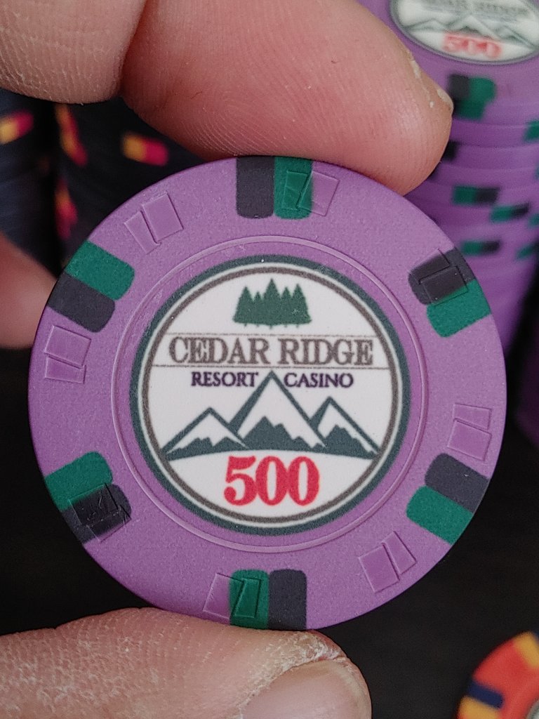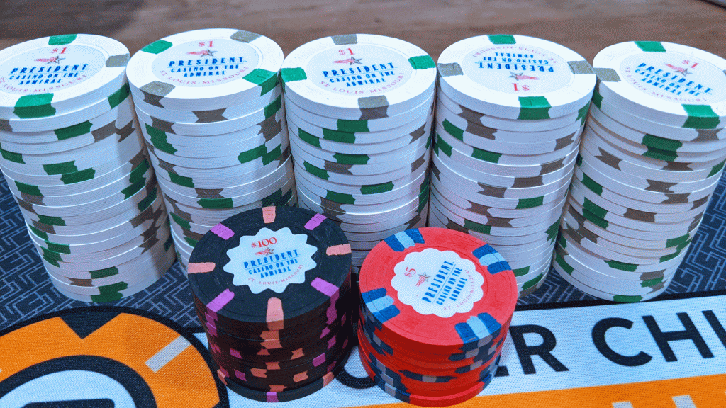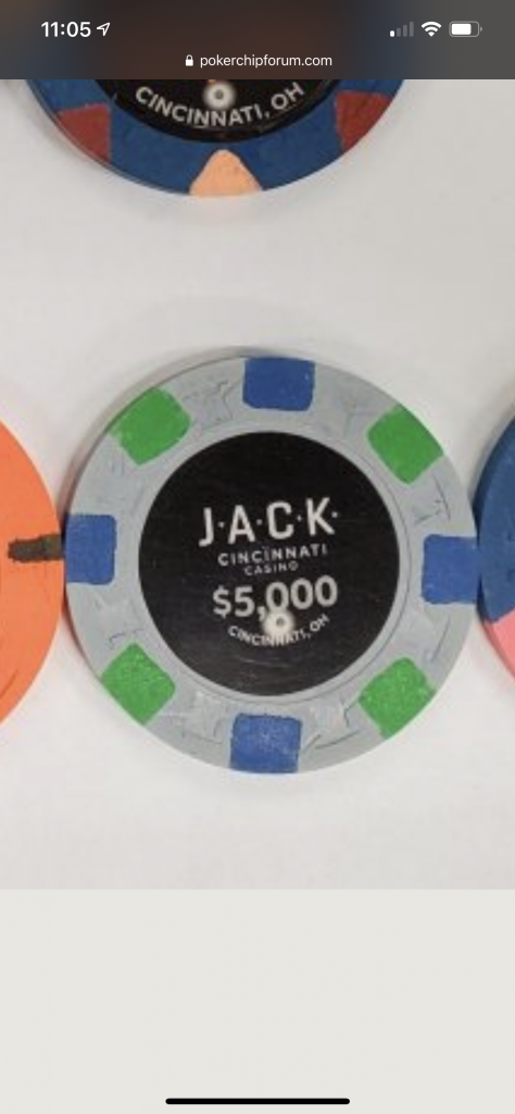 Doesn't show well in the picture but that far right $5 is absolutely not radiant red. I have kept one light inlay and one dark inlay of the chips I have found. Still need a regular triple edge spot shaped inlay $100. The 4 set in the capper is the only one I have ever seen and usually drag it around with me to show off.