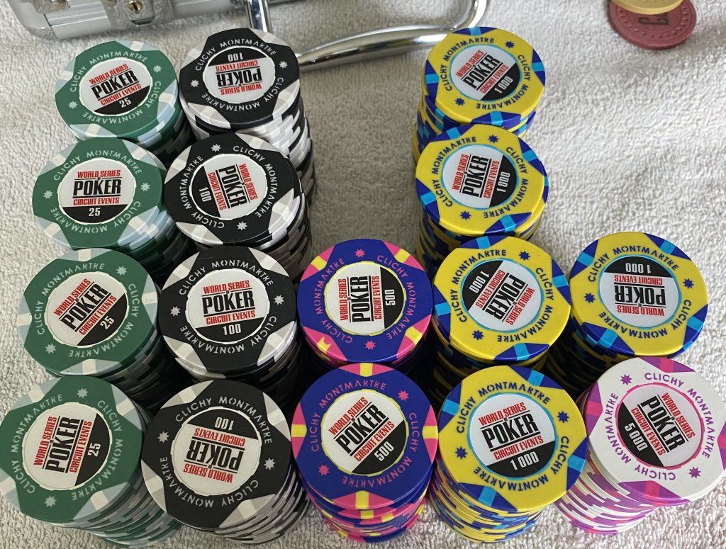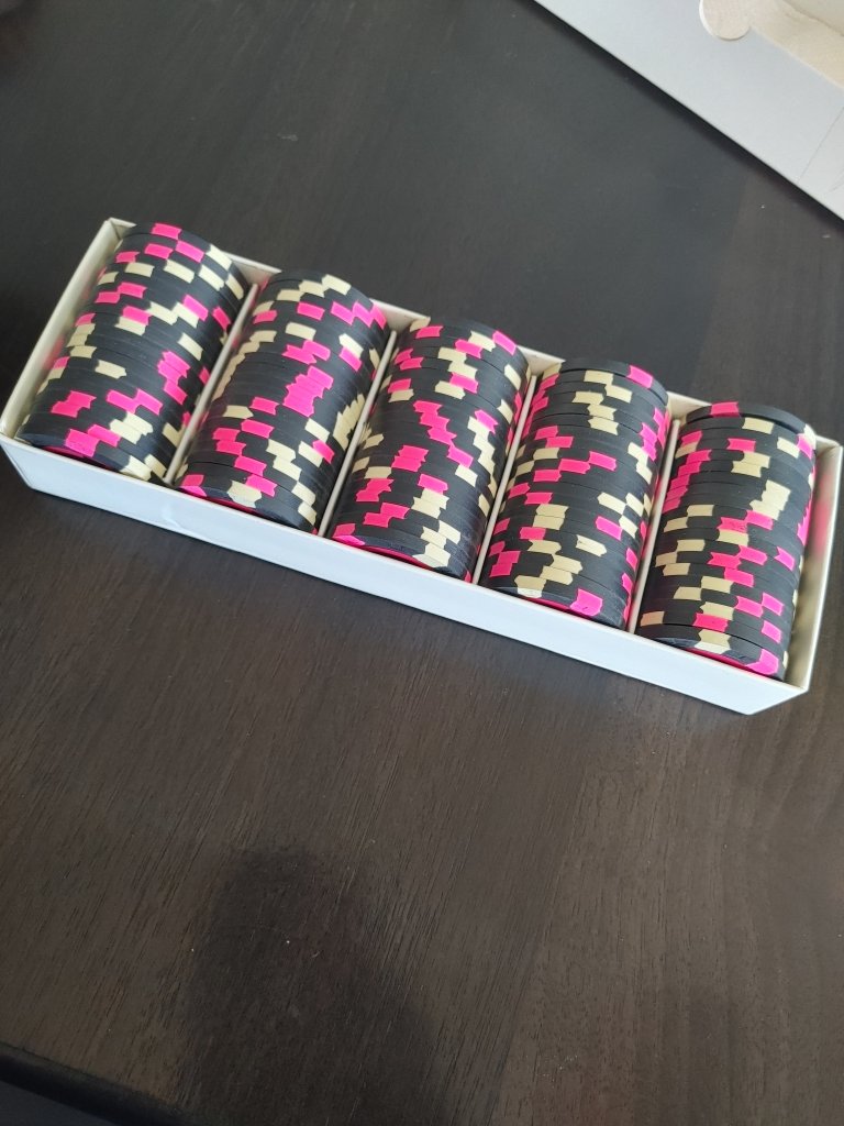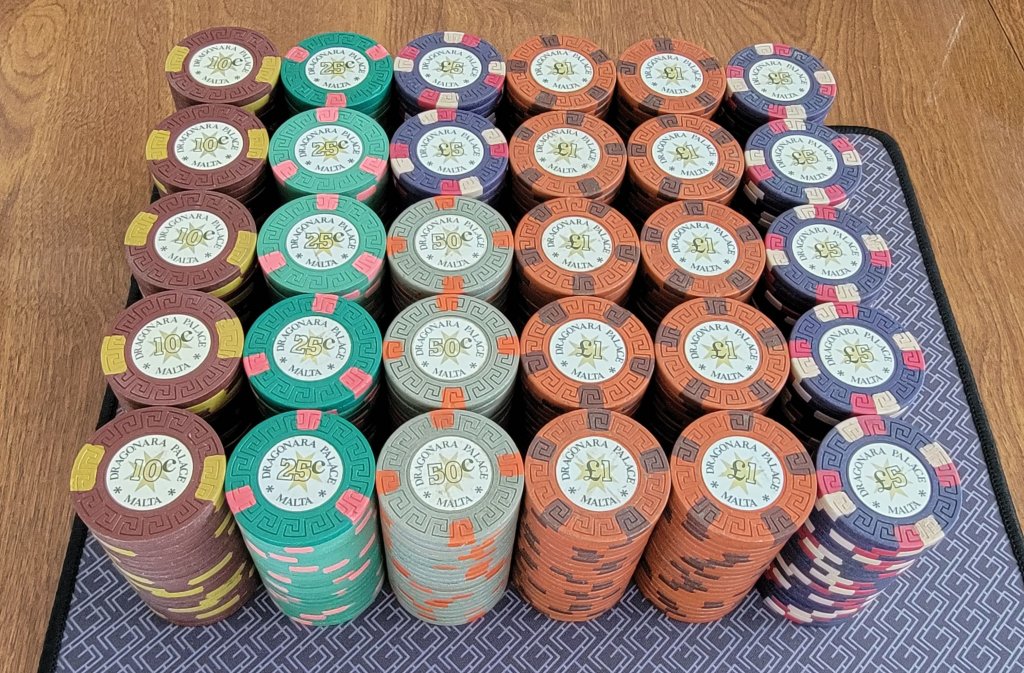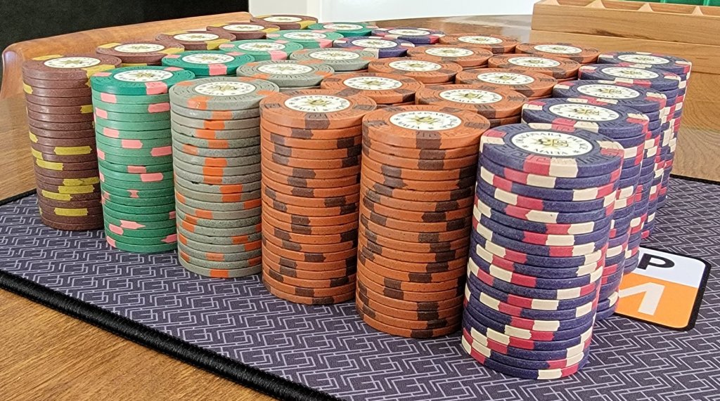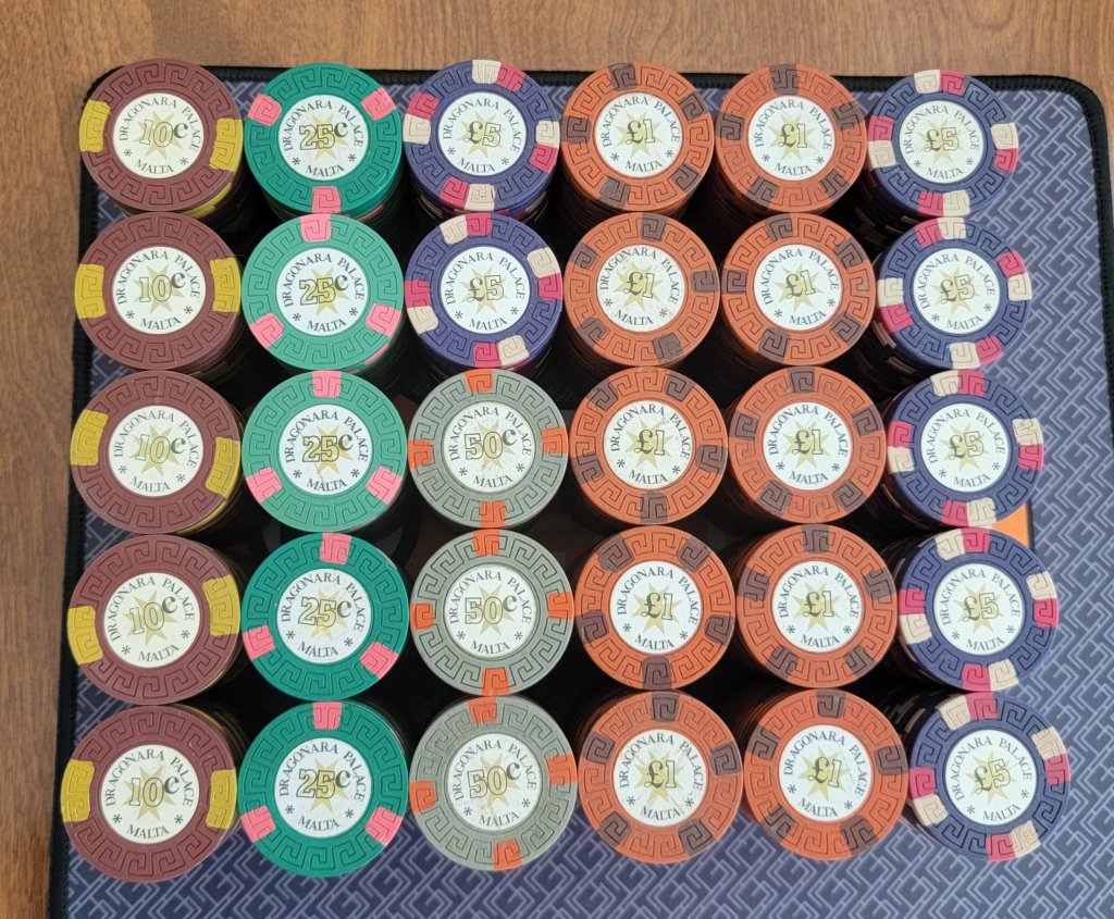 Thank you @chipinla for the AWESOME vintage Dragonara Malta Large Greek Key Mold set. Very playable 600 chip cash lineup (5 pounds / 5 dollars - same diff, right? ) that will see LOTS of felt in the near future. Photos (at least the ones I can take) do not do these chips justice! They are really cool! With a little bit of cleaning they will be stunning! Most of the 10 cent and 25 cent chips are Excellent to Near Mint, and the rest are really nice casino used condition.