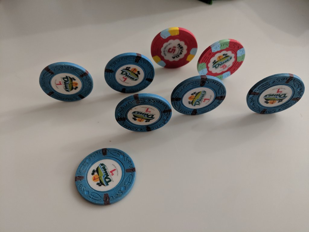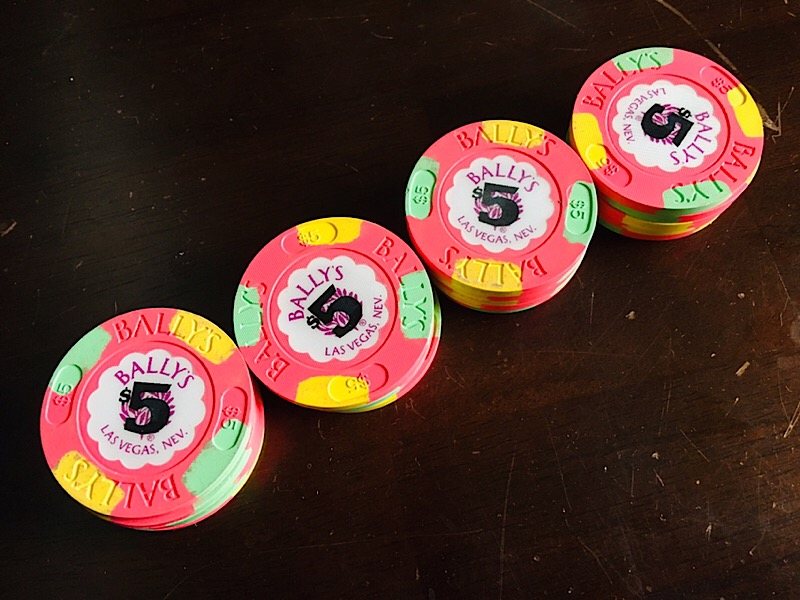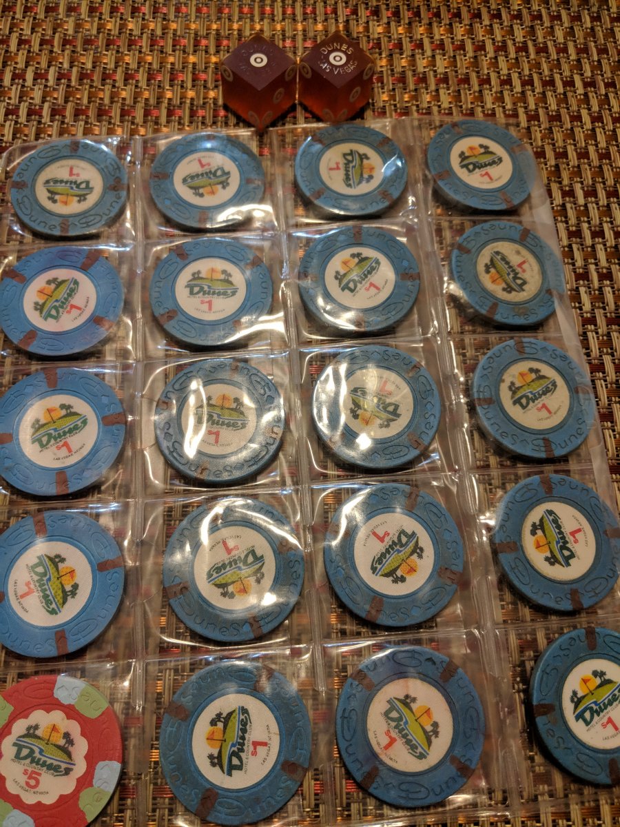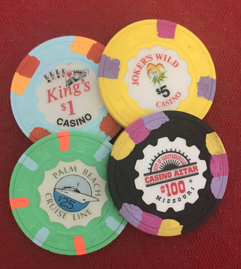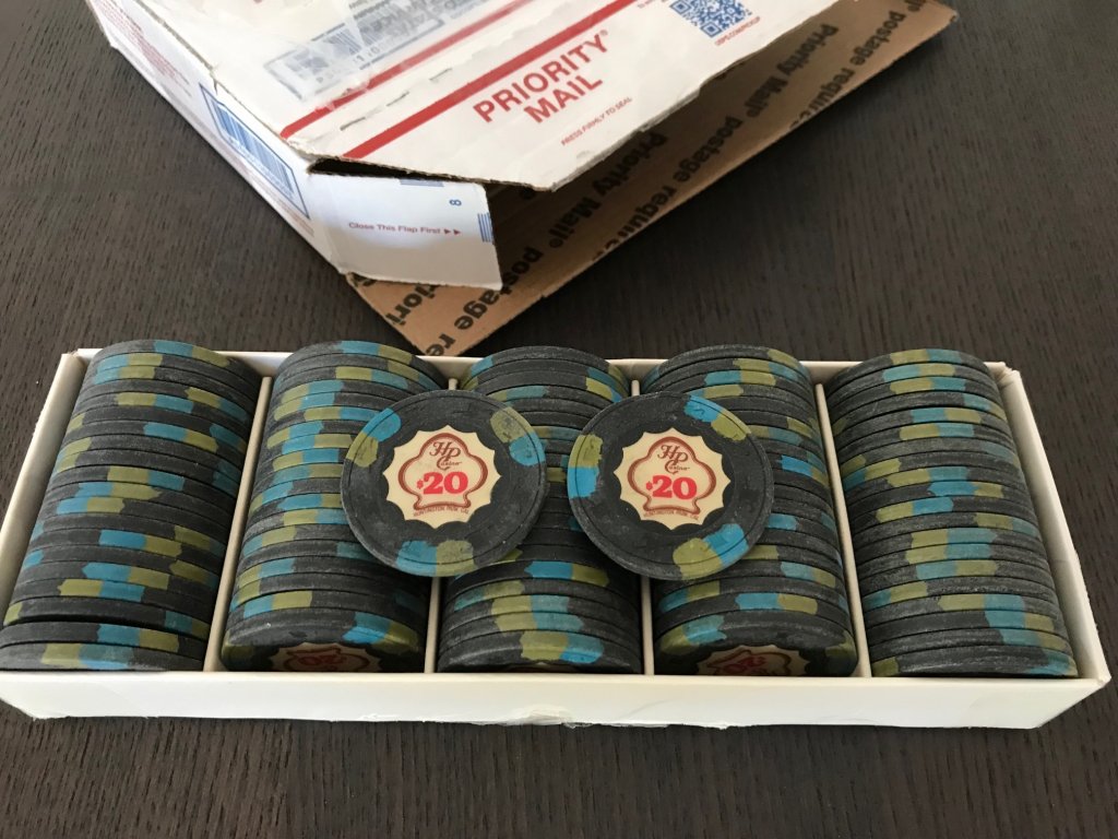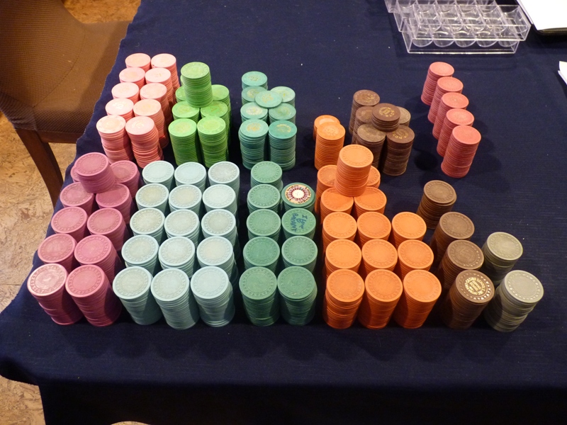 1100ish Langworthy MD-32 Tri-Club mold stamped solids (no recess, mostly dealer school stamps). 20 defaced with a garish sticker (all spinners) and 1 with "I love baccarat" scrawled in felt pen over the face.
