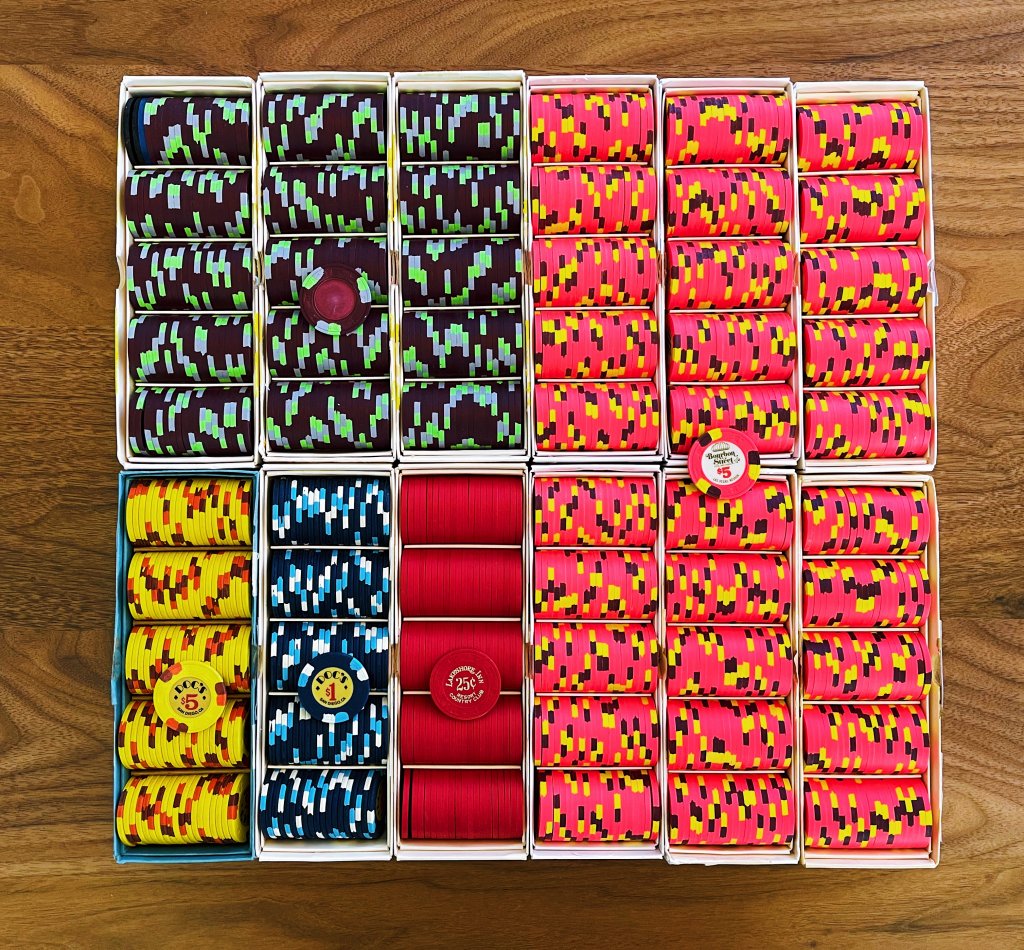 - A couple of racks ($1s and $5s) found off-forum to increase the playability of my Doc’s set. By all accounts, probably the most “buttery-used” of all my sets, but there’s something about the inlay and the design that gets me.