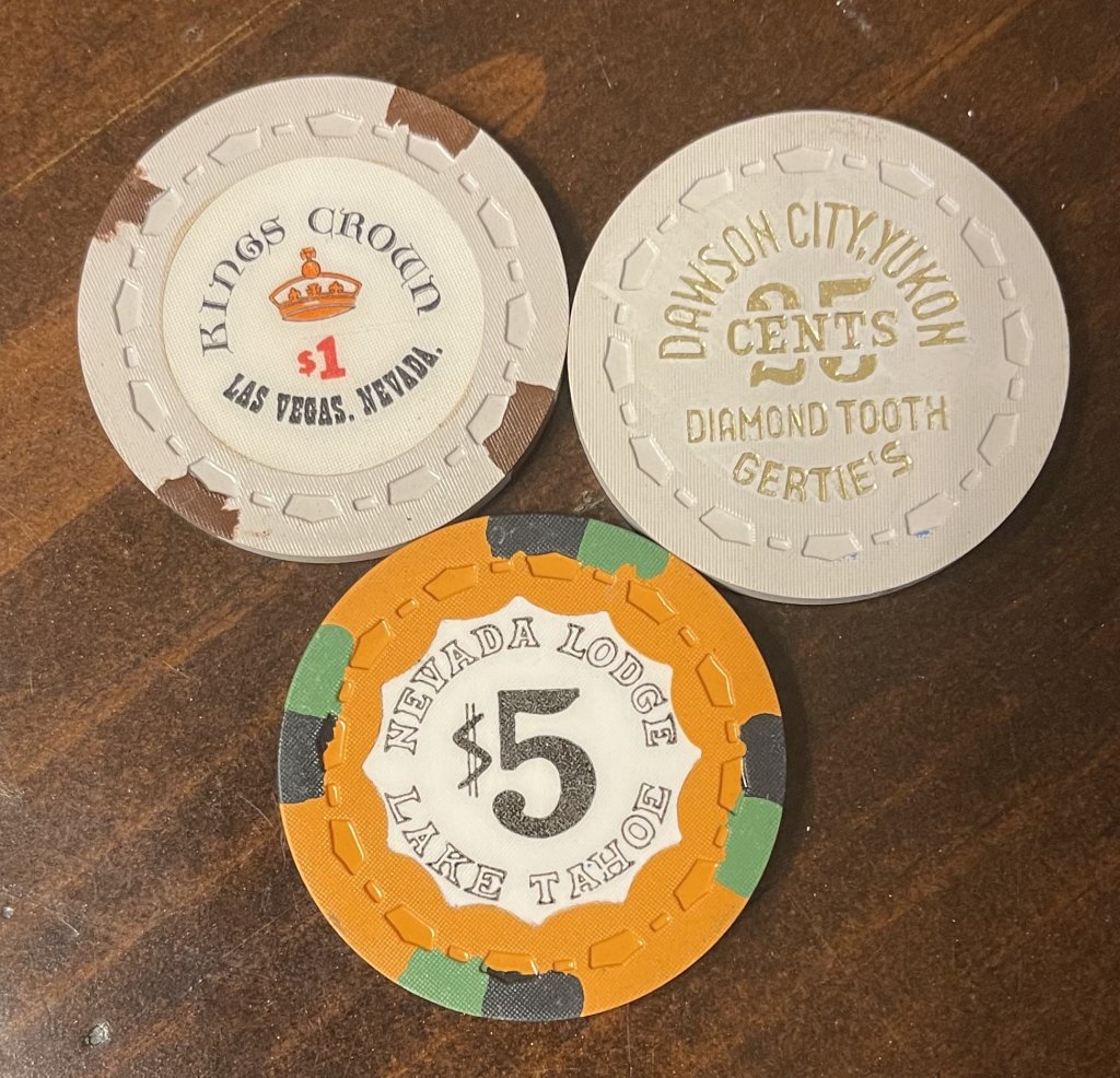 Diamond Tooth Gertie's just might be the best casino name I've ever heard of lolThanks @RichMahogany for the Nevada Lodge and the Diamond Tooth Gerties! You also win the award for the most overpacked for 2 chipes as well! And $1 Kings Crown from @Spinettis Gaming , only the $1K chip is in route for a complete sample set! All sharp edges and super clean chips!!