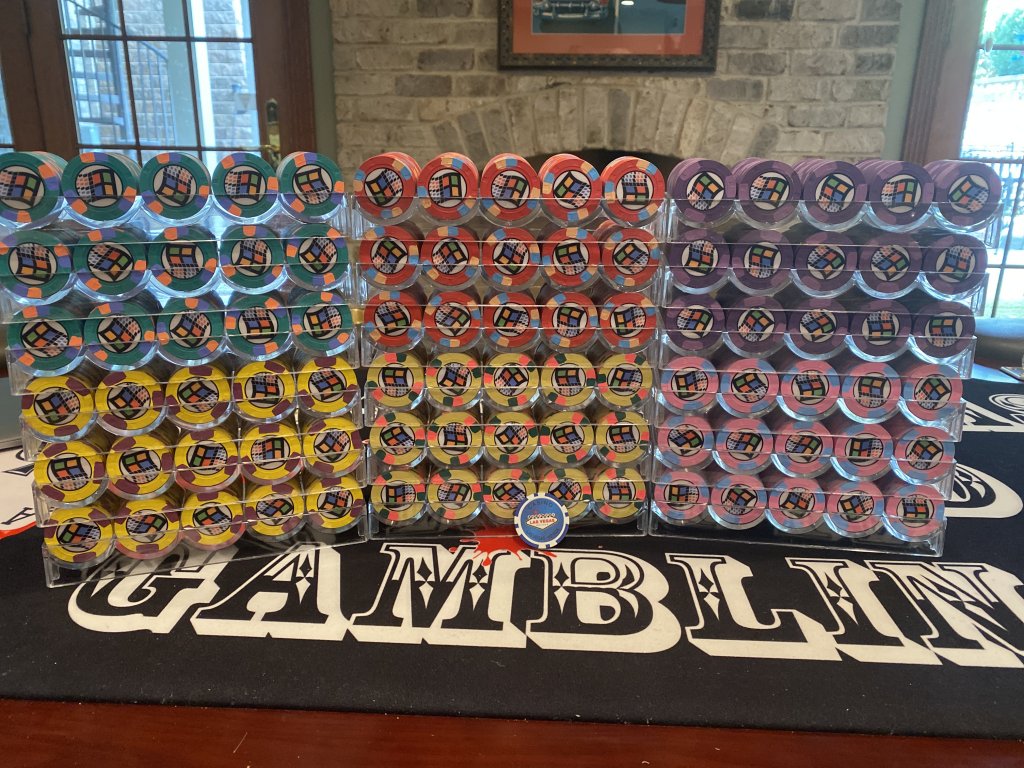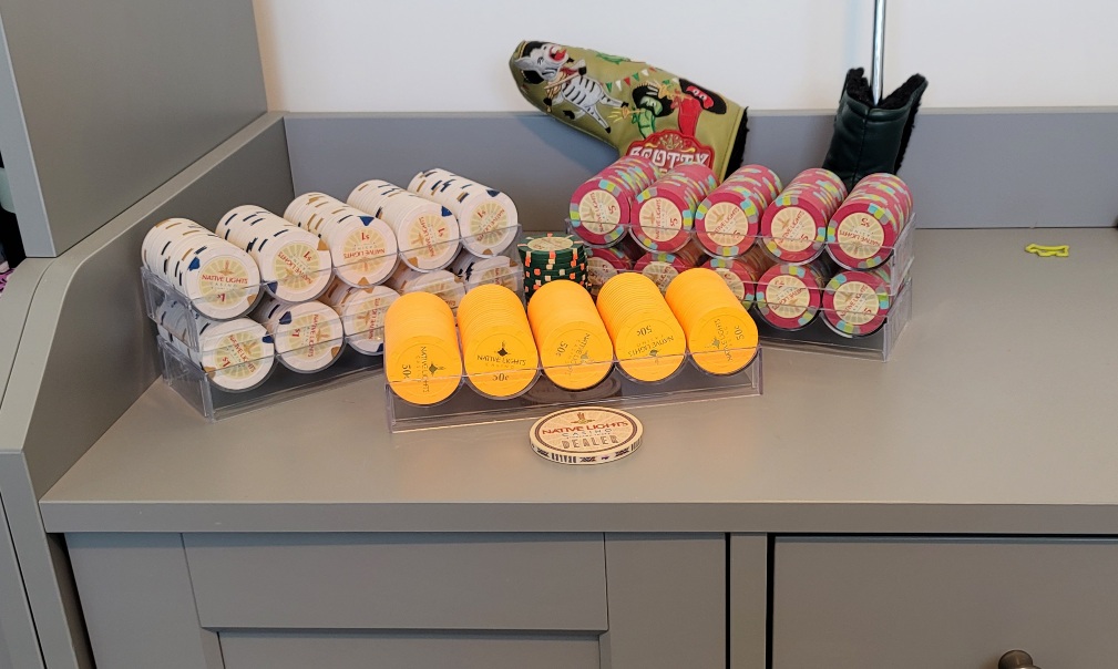 And a temp/ side table arrived today to get the games rolling at the house after the BBO debacle. Game room is coming together- need to hang stuff on the walls, clean up, and get the Gassers out of storage. Tried out the micro stakes set to see how they looked