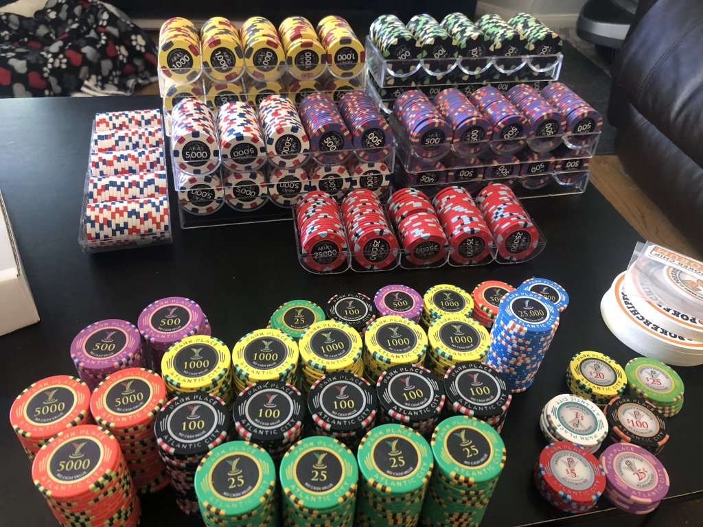 I decided to expand my Tigerhawk Card Room tournament set. Changing the T100s to T25s, and the new red chips are the new T100s. Also added more light blue All In chips, and the grey chips are my new seating chips that can handle multiple tables. Thanks @Apache for the chips, and @ABC Gifts and Awards / @BR Pro Poker for the labels!