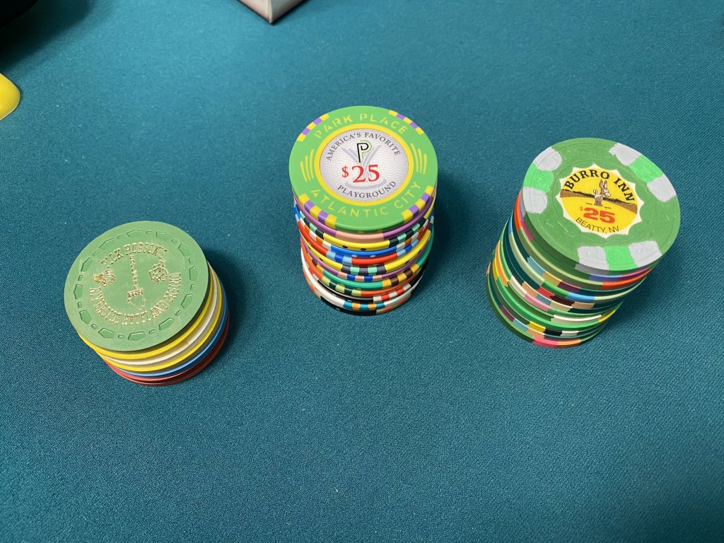 3player $20 or $30 buy in with some extras for $20 rebuys. Could also do 4players $20 buy in with less rebuys. I won't have to break out the Vegas house mold set for small cash games now. And yes, the third player has a different stack because I am short three quarters :wtf: