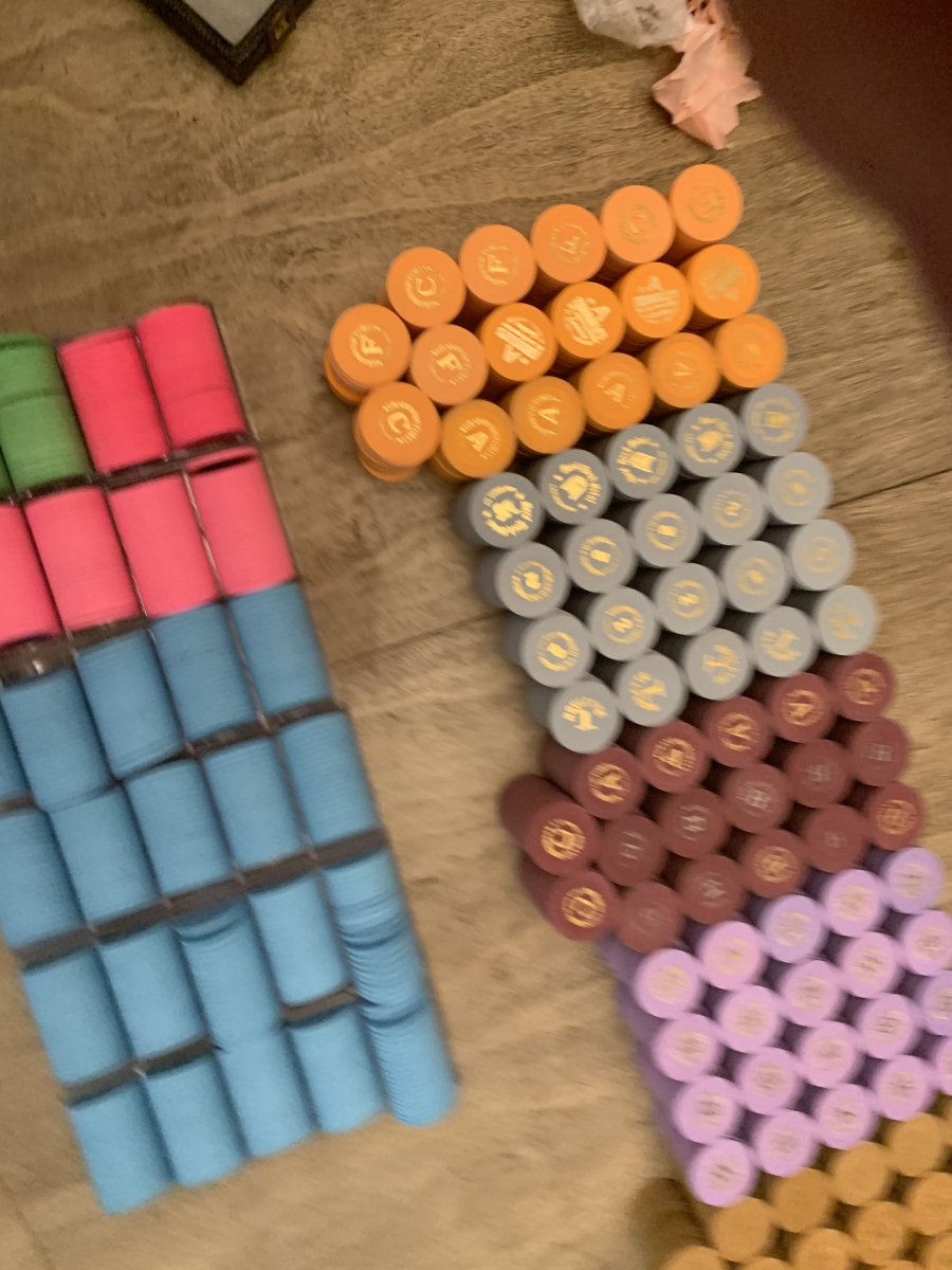 Thanks guys here’s the pre pron, the tourney set (mostly minty) is clocking in at 1820 chips +spares and the fluorescent cash set is another cool 600 (worn but oh so shufflable) + Spares.