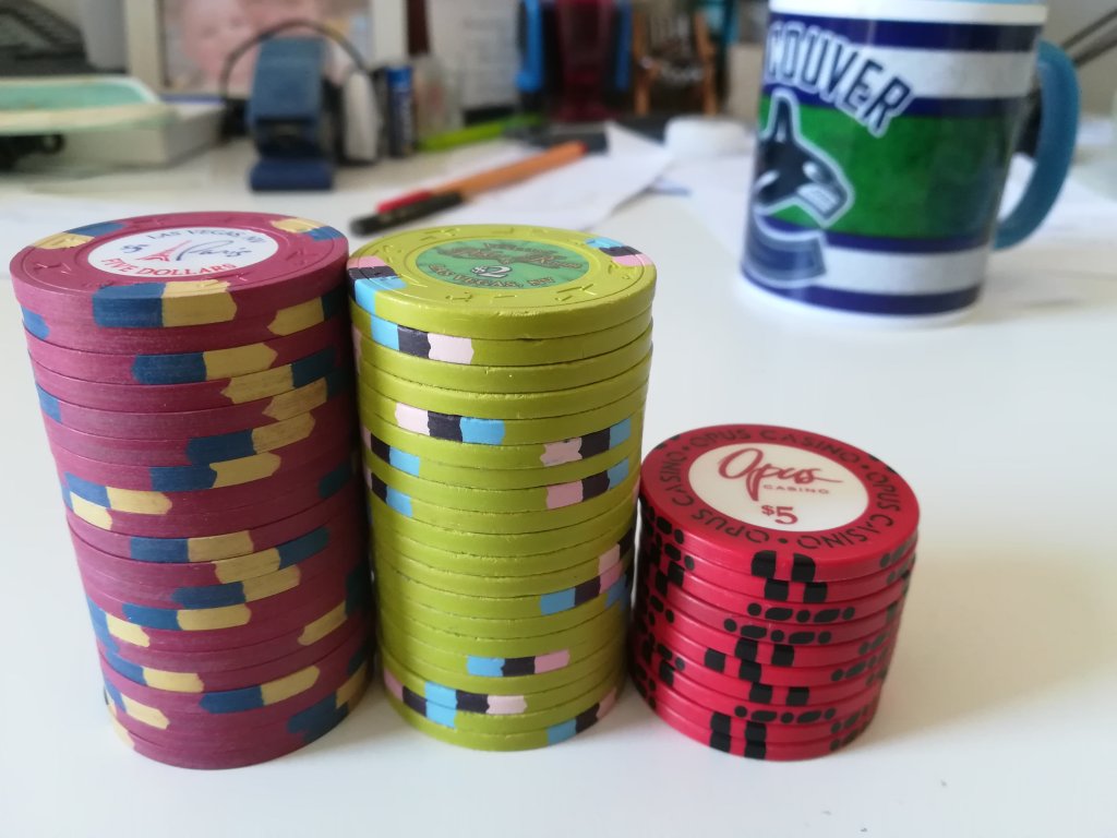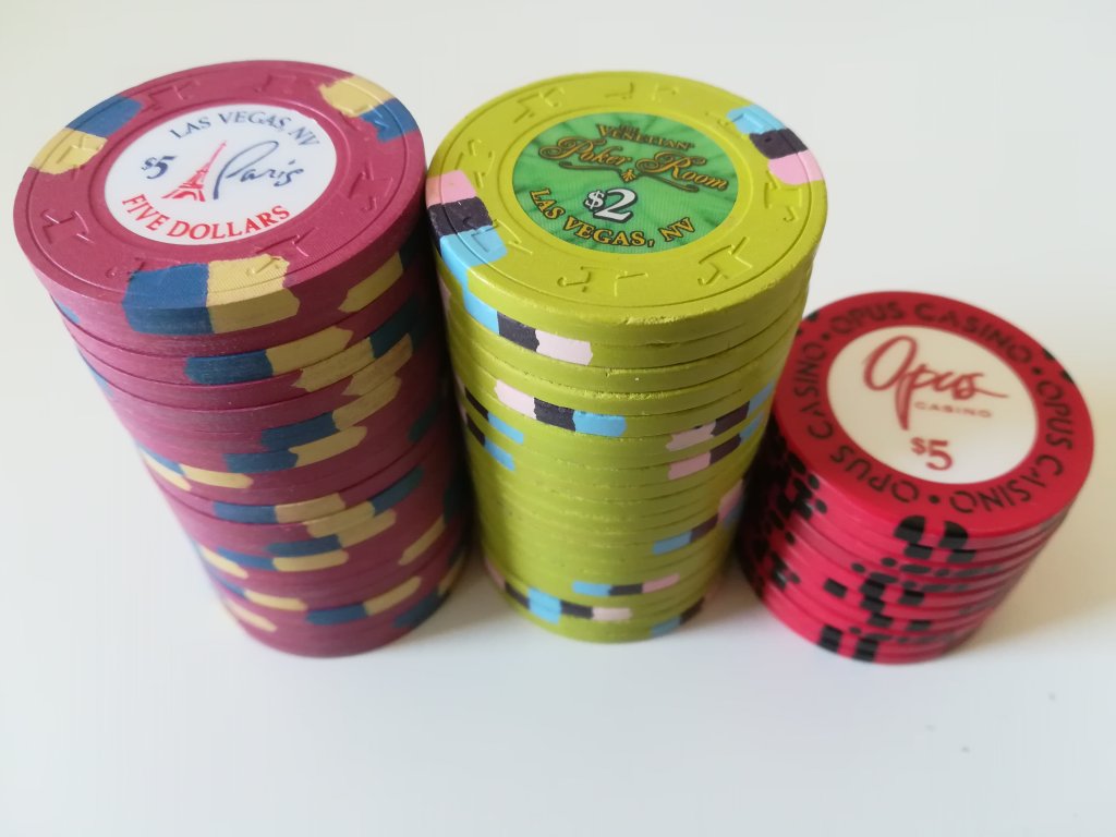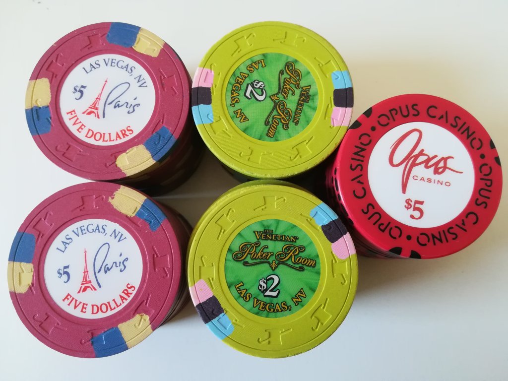 I don't usually like ceramics, but these Bellagio chips are very nice! Thanks to @Colquhoun for these, I'm in for a set 100%. Little comparison picture of a $5 next to a real $5. Next, thanks to @Marhault for The Pen sample set, colors and design are amazing. So hard to get the $5 color correct in photos, but so nice. Then big thanks to @JWC for the TRKs! Always can use more in the collection ;)