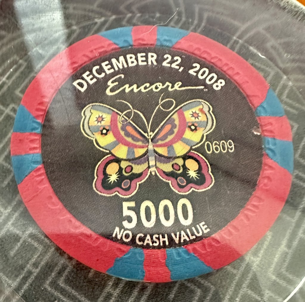 To me that looks like a chip whose top layer has been removed. The little mark at 3 o'clock position on the butterfly side looks like where they dug in the tip of a knife. Also the fact that you can see "WYNN WYNN WYNN" all over the face of the other side? That's the remnant of UV ink, which isn't visible normally, but you can see it sometimes when the top layer of an inlay is pulled off. (I've seen it before, not on Wynn chips, but on other chips that have UV markings all over them.)