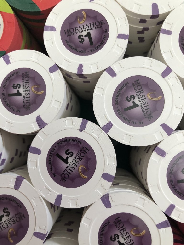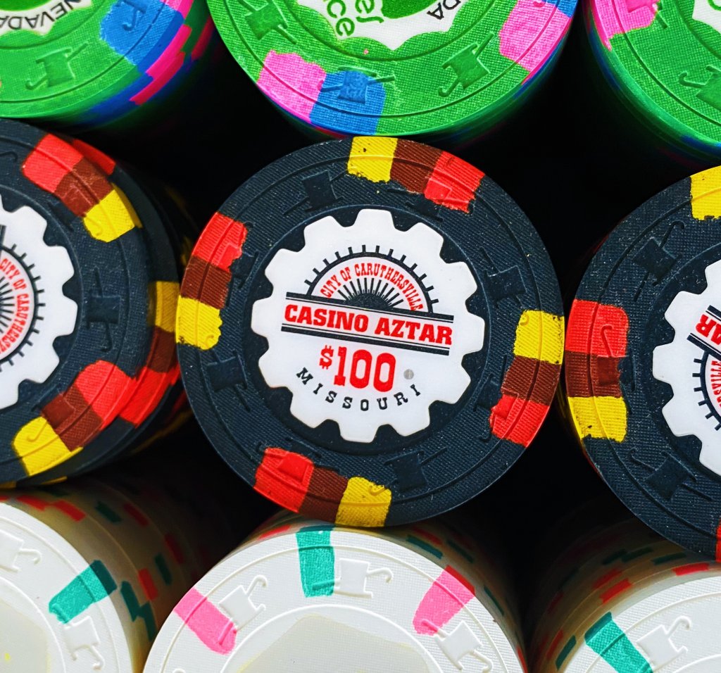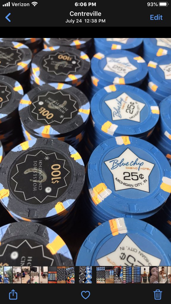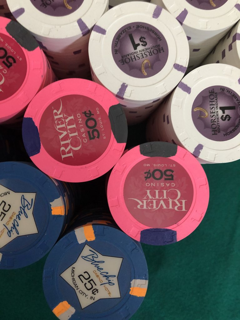 This was prior to 43mm high-denom chips becoming readily available to the community. My fav configuration was Pointe After $5, Aztar $25, PCA $100, LeCove $500, and Empress $1000 -- with all chips containing x18 spots. There are a few pics of various versions in the Home Games photos section.