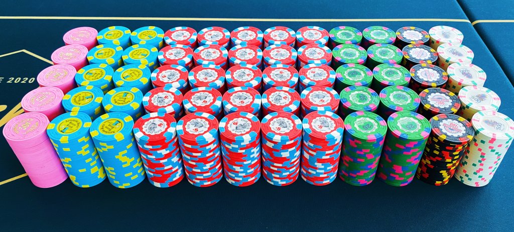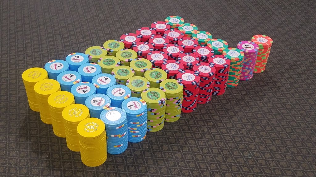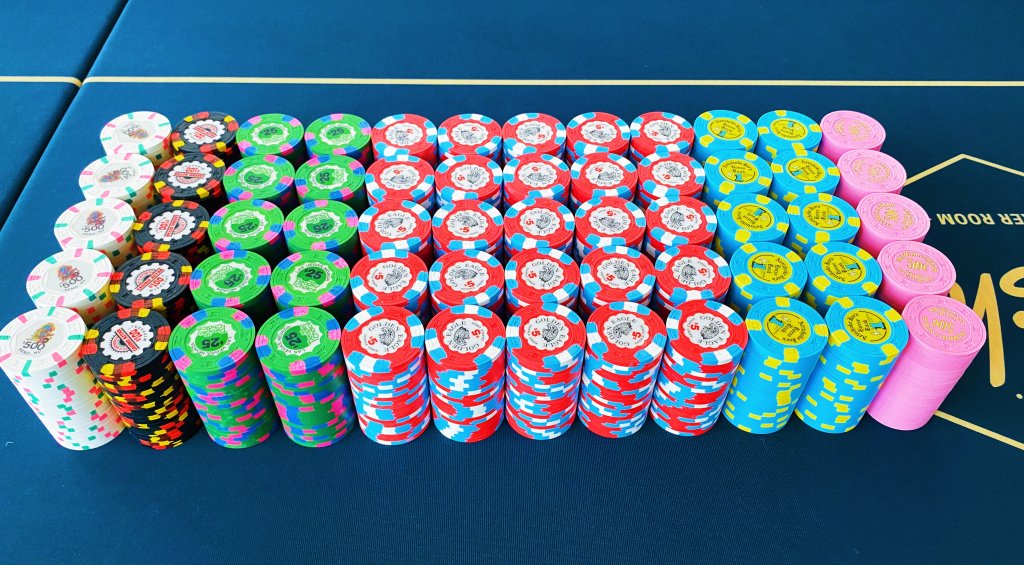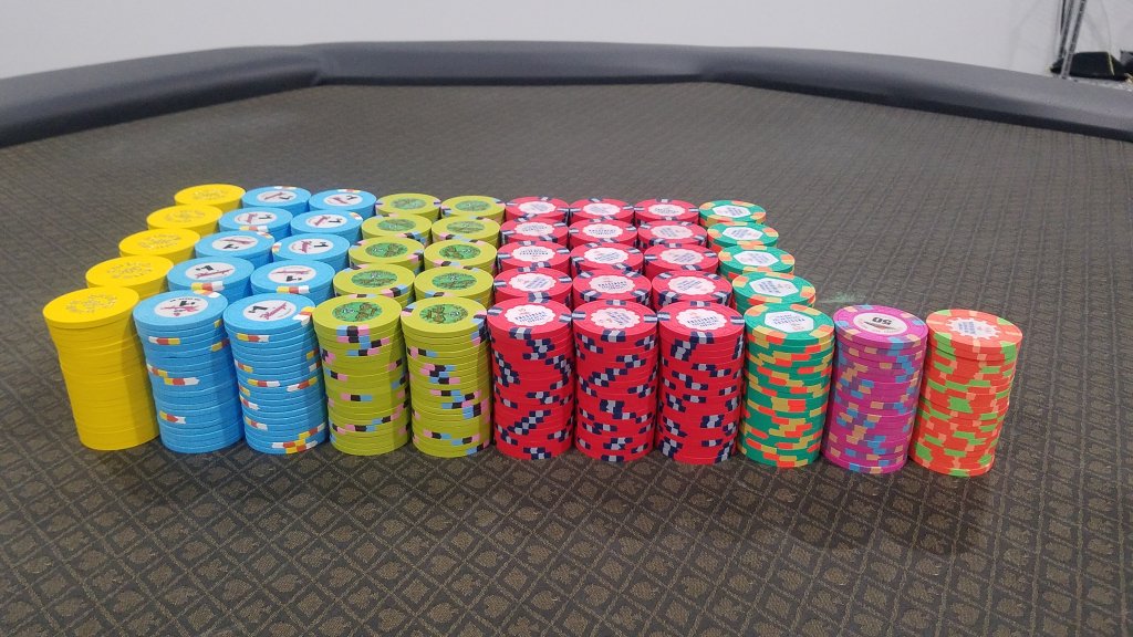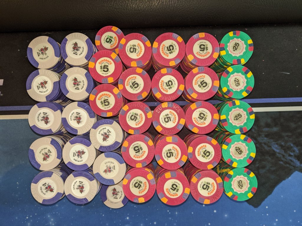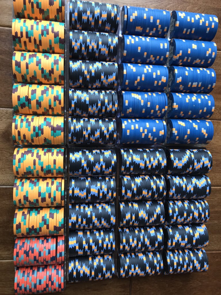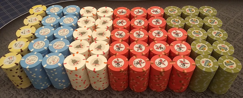 My current x18 mixed tourney set consists of $25 Regency Cruises, $100 Copa Casino, $500 Eddies Fabulous '50s, $1000 Casablanca (relabeled red brick $100s), and $5000 Circus Circus (relabeled blue $1s), plus I have a large all-43mm mixed tourney set.