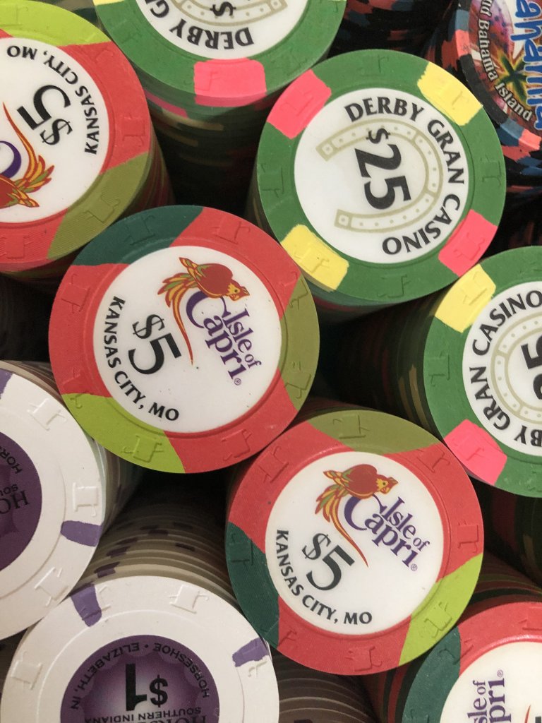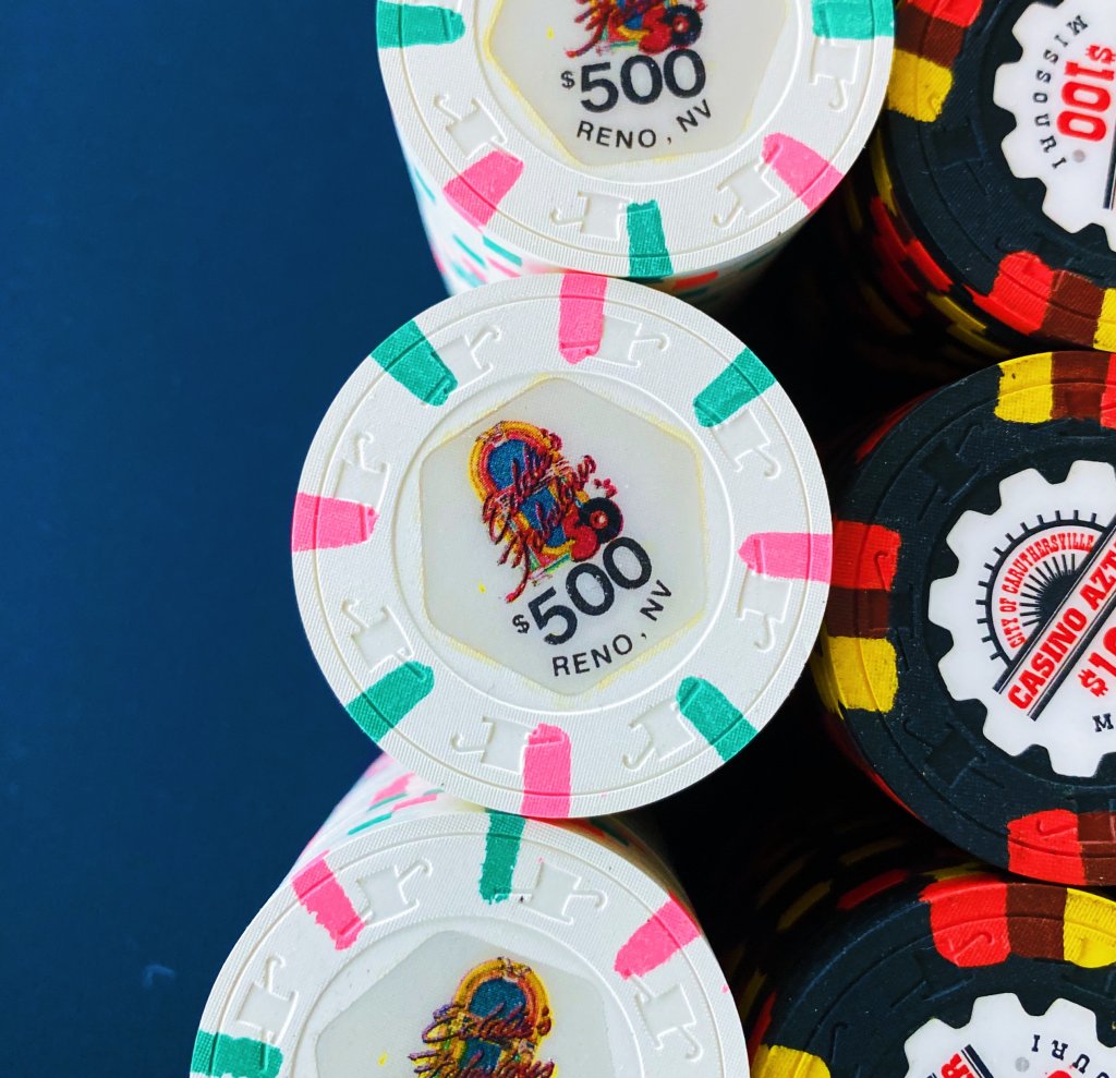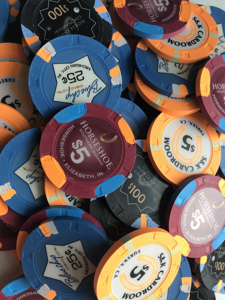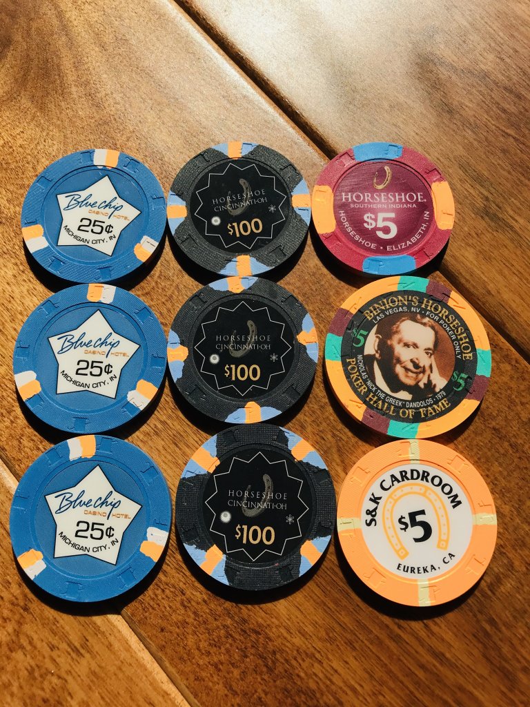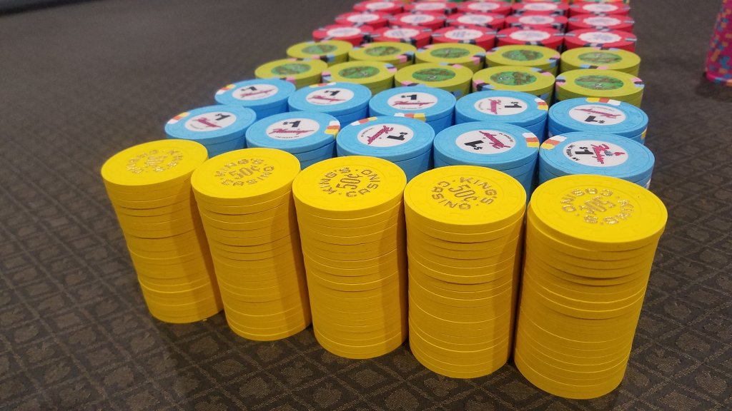 My current x18 mixed tourney set consists of $25 Regency Cruises, $100 Copa Casino, $500 Eddies Fabulous '50s, $1000 Casablanca (relabeled red brick $100s), and $5000 Circus Circus (relabeled blue $1s), plus I have a large all-43mm mixed tourney set.