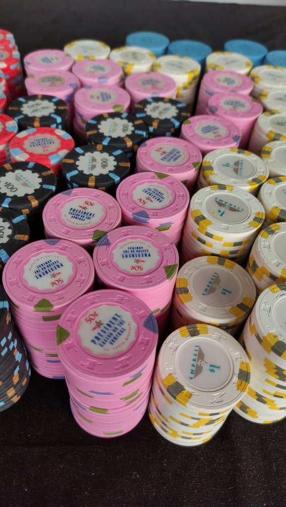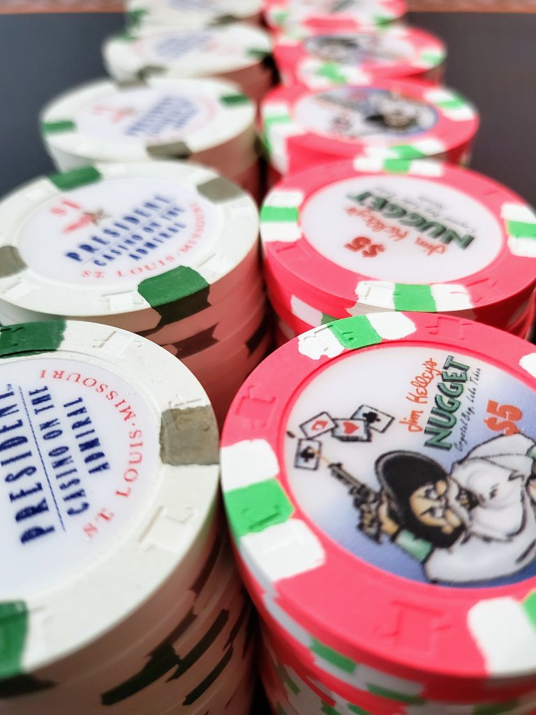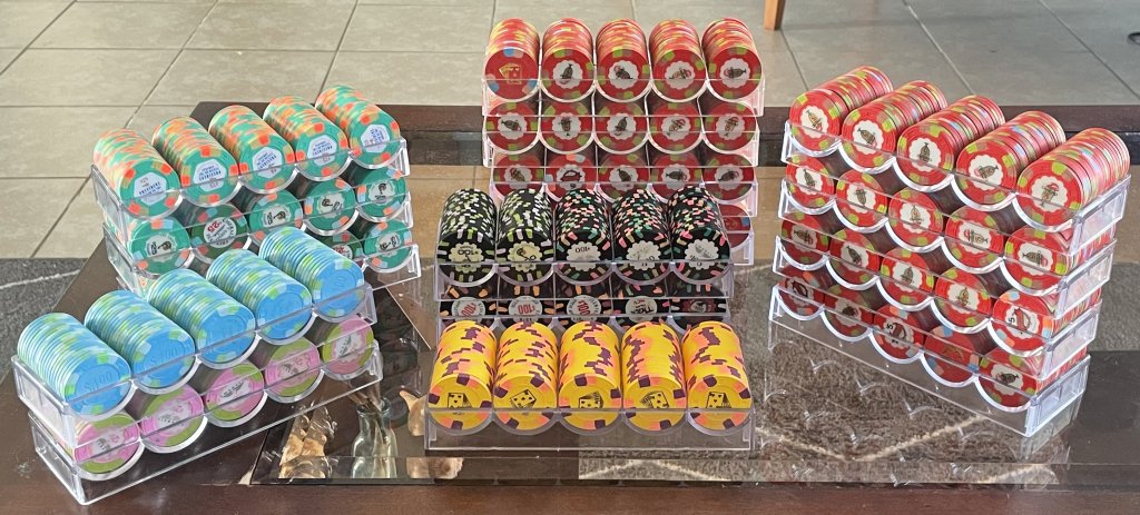 Those are the major consistencies which are common. Some people like to have a common location, like all Vegas chips or even all Strip. All shaped inlays is a nice (but expensive) touch. Another really nice touch which can be difficult to accomplish but gives a polished look is having all the denominations the same color. Most chips’ denominations are printed in either black or red and if you can get all the chips in your set with the same, it really pulls them together.