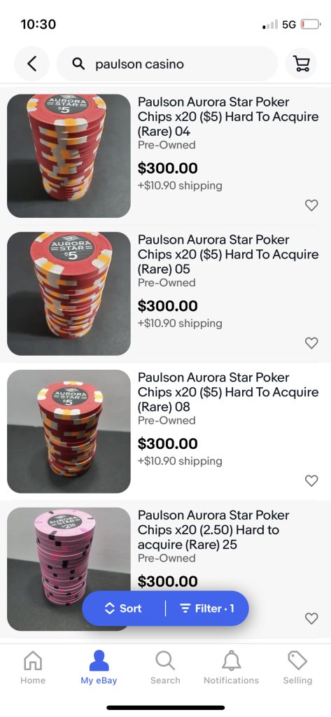 any past sales confirming that they are actually selling at that price? 13% eBay fees really doesnt help either.Just browsing eBay for the hell of it, noticed that anybody who has a rack or more of Paulsons for sale, ex-casino or fantasy or whatever, is asking at least $10-12 per chip or $1000 per rack, minimum. Has it been this way for the past while?