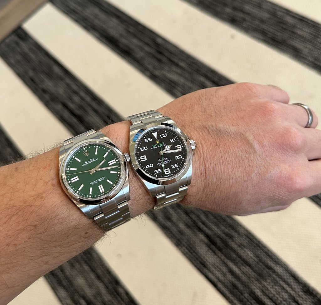 I've actually been thinking about an OP41, w/ green dial. I don't own a rolex, I REALLY don't like the cyclops/whatever thing they do on dates so I wouldn't get any watch from them with a date function, and 40/41mm is about as small as I'd go. So either a steel OP41 or an Explorer 40, but I kinda dig the green dial.Thankfully, I've got a good relationship with my AD as he lives down the road from me, so I'm just going in at the deep end. He's said that these are realistic, both of which I love: