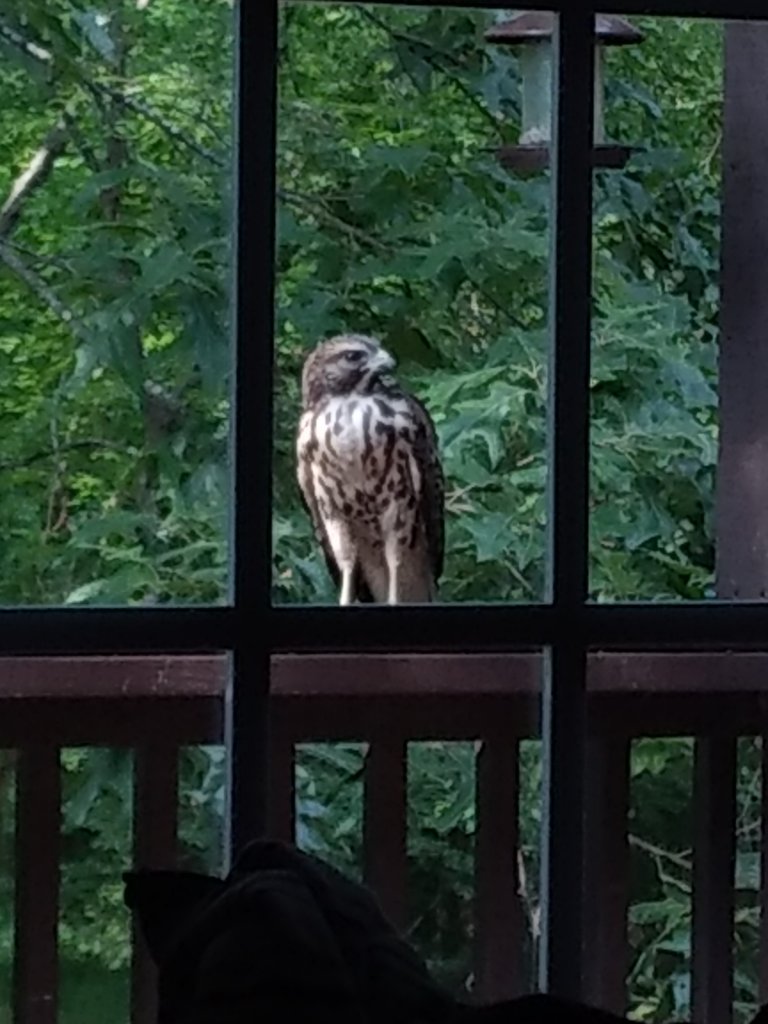 A hawk landed under the bird feeder, gave a look to imply "fill this back up so I can eat the squirrels that show up", and then flew off.