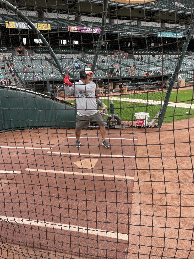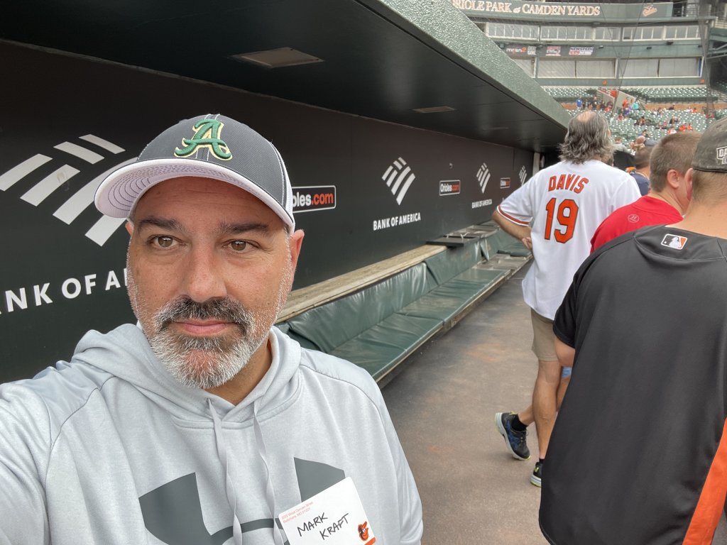 Being on the field, in the dugout, and taking swings at the plate in Camden Yards. (The A’s hat is my son’s baseball team, which I had to go to afterwards)