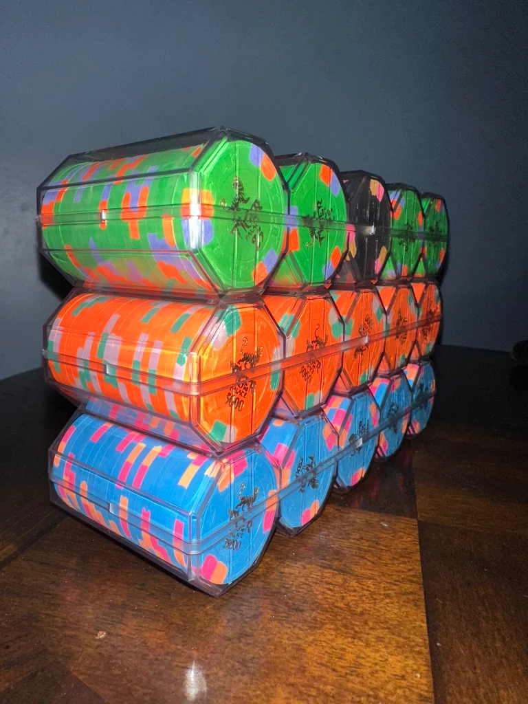 My edge spot progression isn’t ideal, but these babies sure to brighten up a poker room! Since my cash sets are all pretty old school as far as colors, I definitely wanted LOUD for a MTT set.