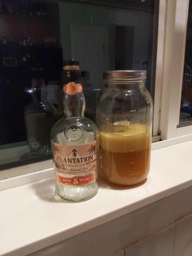 I took about 300g of butter (I think it was salted) and made ghee out of it. (Melted, heated, clarified by skimming milk fats, and browned for flavor.) Dumped that right off of the oven into the rum (in that large mason jar pictured) and blended for 30s with an immersion blender. Let separate for about an hour, and then into the freezer for an hour to solidify the butter. Poked a hole and strained it out through a nut milk bag.