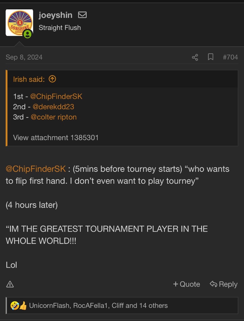 Or be like me and bitch and moan about it until the 2nd or 3rd hand, then raise POT MF'rs...... :LOL: :laugh: