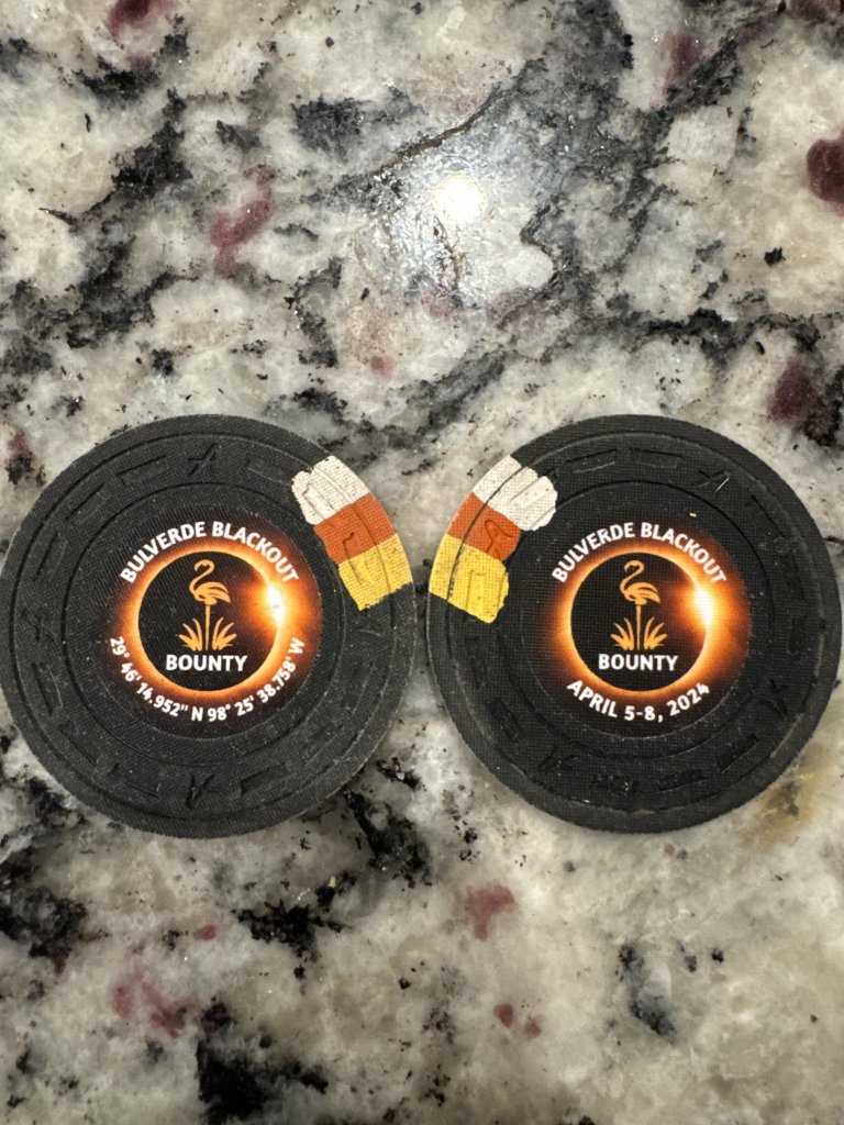 This is one of the coolest inlays I've seen, especially in view of your sanctuary. Really nice work!Hopefully the clouds ease up a bit. They seem to be but you never know til Texas weather. Had several PCF members come down for a mini meetup and now just waiting for the eclipse. Here was our meetup chip.