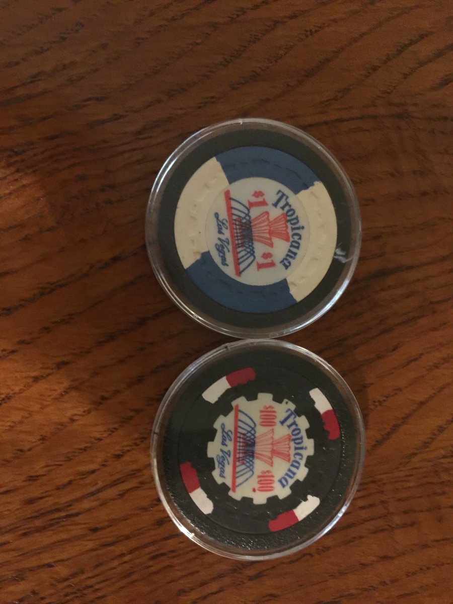 I began buying single First Edition chips off eBay and the chip Board. I had spent quite a sum as many chips were over $100 each . One day I found one old time collector with 14 chips of various denominations. Shortly after, I broke the news to my daughter that she was now going to community college because daddy had raided her college fund . I started making calls and emails to the CC>CC membership inquiring about Tropicana first editions in any quantity. I received a bunch of responses of " I wish I had some" . One day I received a call back from a guy that had purchased some chips directly from TRKING before they closed. TR King would keep extra chips to replace damaged chips for the casino. Fortunately this fellow had 14 $100 chips and 16 red $25 chips left from that purchase. Over time, They all became mine. After that, I broke the news to my daughter that college was now on her dime.