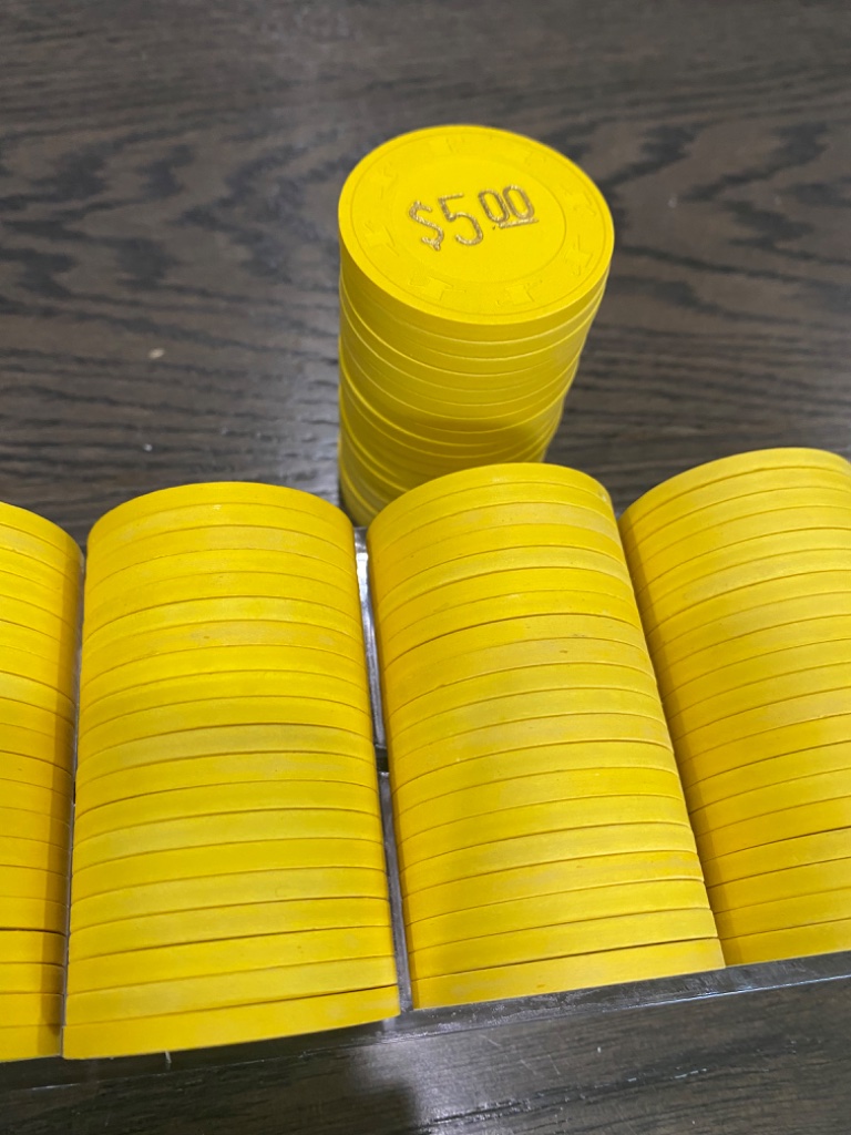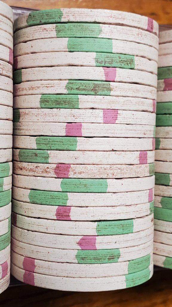 Some Casino Aztar Primary $5 chips prior to cleaning, under the harsh light of a flash (not flattering to the chips, but shows the dirt better):