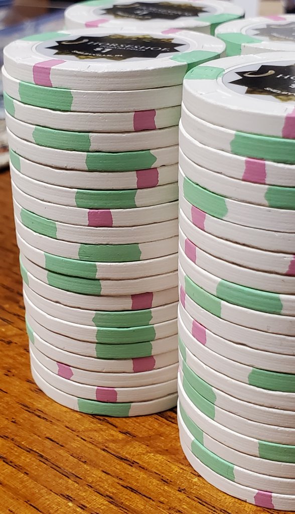 This process results in completely clean chips for me, with absolutely NO brushing, scrubbing, or wiping whatsoever (i.e. no toothbrushes, Magic Erasers, etc.). Using this process, I am able to consistently clean 1,000 Paulson RHC chips (such as dirty Aztar E, Par-A-Dice, and Garden City casino chips) in an hour. This timeframe includes a 45 second ultrasonic bath for 40 chips at a time, plus the time necessary to rinse the chips in clean water, soak for 1 minute in white vinegar (5% acidity - to eliminate cigarette smoke odor if your chips have it - done while ultrasonic cleaning the next batch), pat them dry with a towel, and lay them out flat on a table for overnight drying.