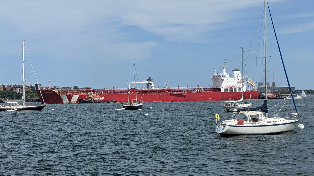 Masts of the U.S.S. Constitution and the Bunker Hill Monument in the distance.