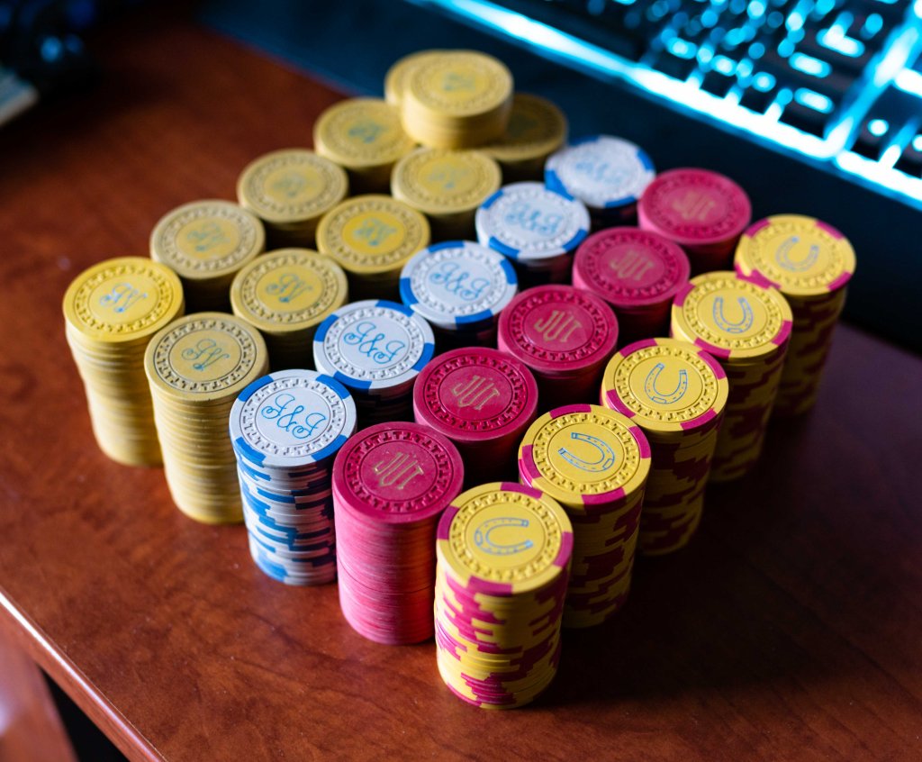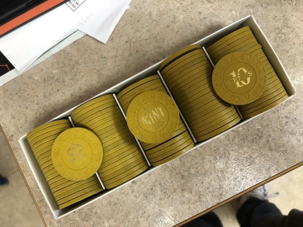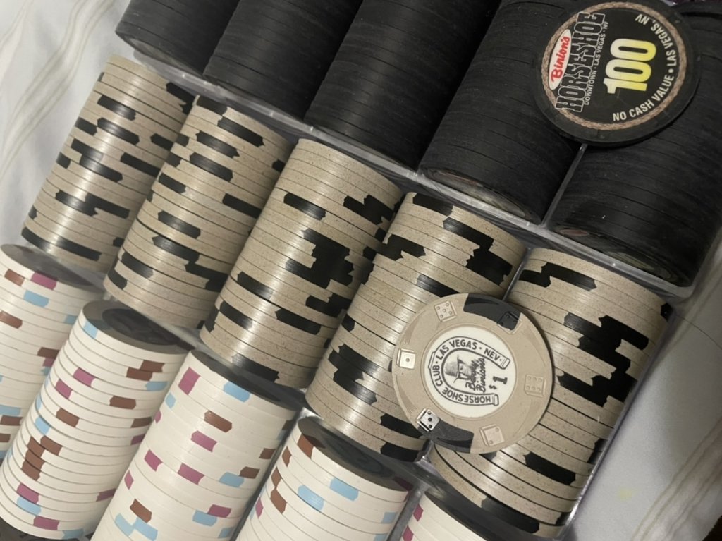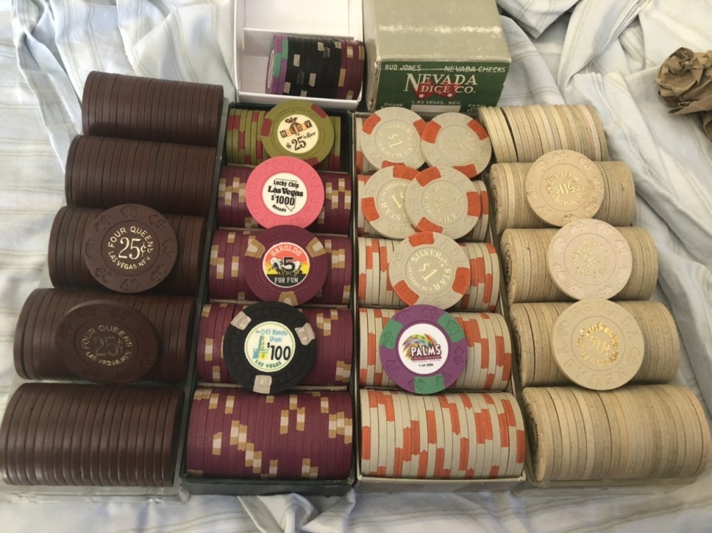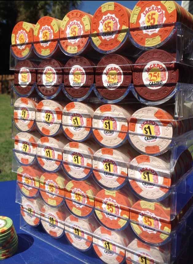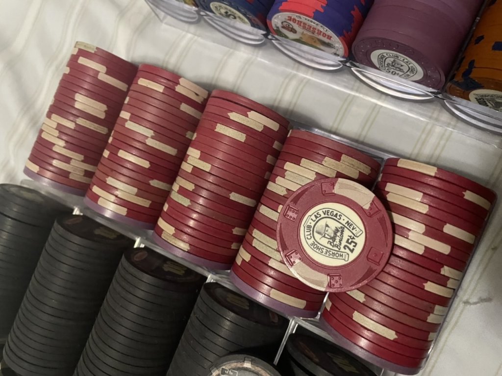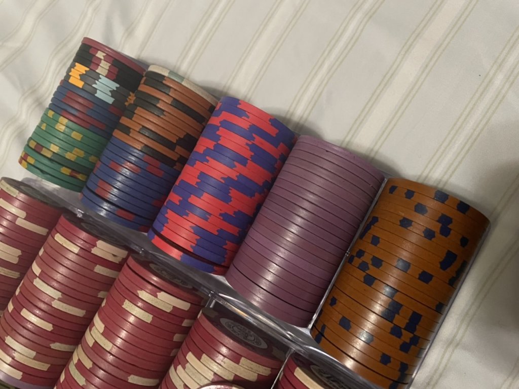 Rack each of 25c, 50c, $1, $5 (missing one or two chips unfortunately) + yellow, purple and gray GCK hotstamps.
