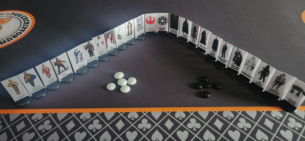 I started with Pente stones. Black for Empire, White for Rebel, placing them in 3 different bags (one bag for each table). The first bag had 4 of each color, so the last player to pick just got what was left. The next bag also had 8 stones (4 of each color), but 7 players. the remaining stone went into the 3rd bag which had 3 of each color.