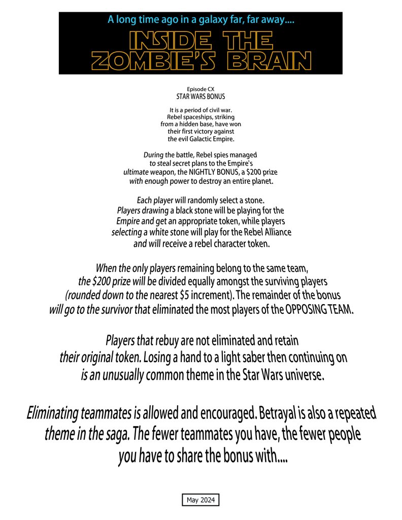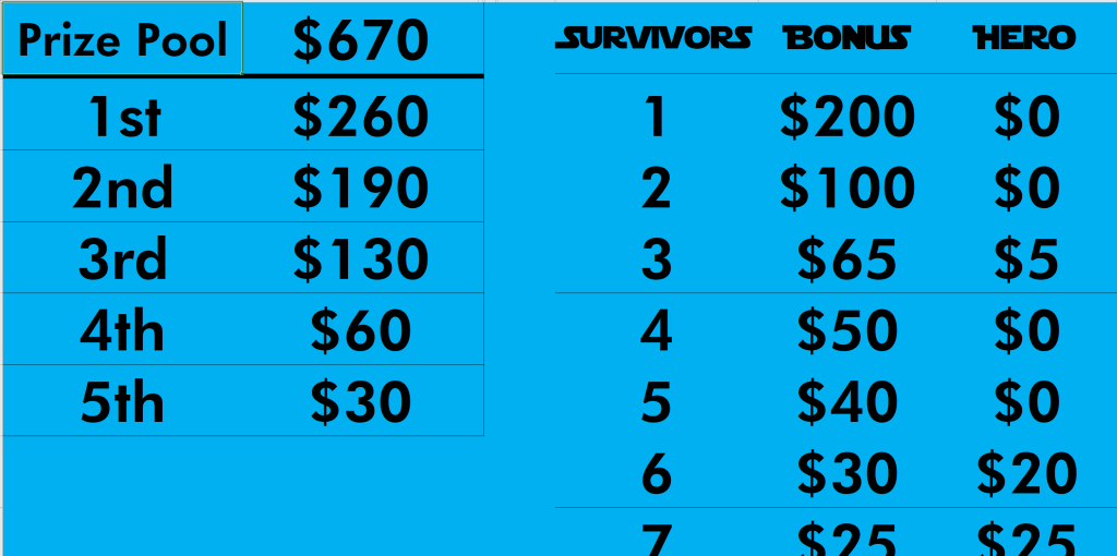 We also shake things up with different bonuses. This year we have a game on Star Wars Day - May the Fourth (be with you). Each player will select a character (Rebel or Empire). When there is only one side remaining, the whole team splits the prize pool that is set aside (probably $100). Knock out a teammate, more money for you. Knock out the opposition, the closer you are to getting paid.