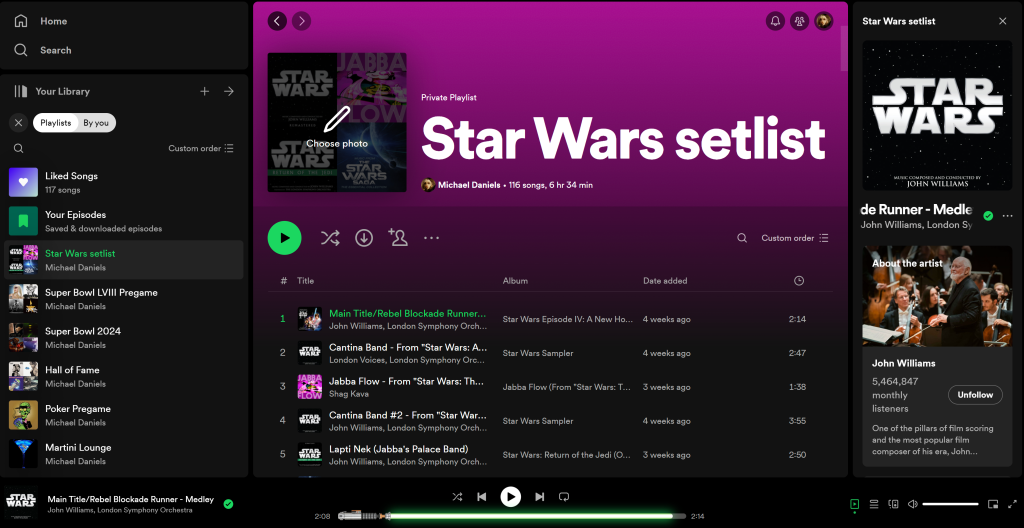 Musically, I built a Spotify setlist called Star Wars Setlist. It was carefully curated so the tempo of the music changed every level. To make it even better, parts of movie soundtracks used for battle scenes were used around the levels where I anticipated players getting knocked out, and the FInale music was used at the final level (these things are all calculatable for tournaments).