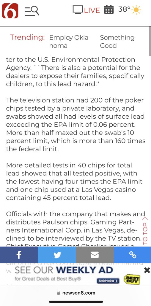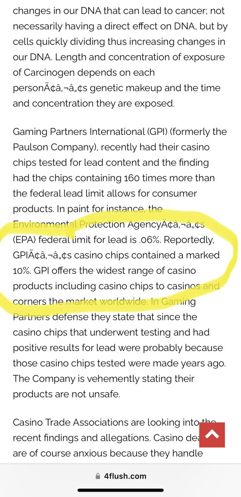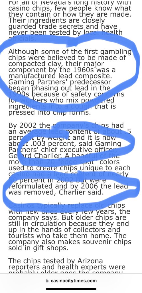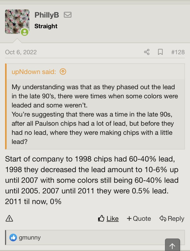 there is documentation of health authorities testing chips at 0.005% actually so they did not remain at .5 and they were forced to make it the state limit at 0.003% lead. And they tested chips at 45,47, 50% and above and so did I, so 45%? it’s not cut and dry like that, some colors had less and some more but most were 45% back then yes but I’m talking range 60-40% average. I said start of Paulson not the Burt co changed over, we are talking about start of leaded chip from Paulson not THC mold(CJ), it’s company, Bud Jones leaving, Start of TRK etc, irrelevant. This lead thing has a lot of variance and what I tell people is that it’s not whether it’s leaded or not, it’s a matter of how much. Also there is a statement of their chips by the company that they are lead free(below) and I tested new chips and nothing, also chips made and bought in 2006/2007 have contained high levels of lead, clearly produced in 2005/2006.